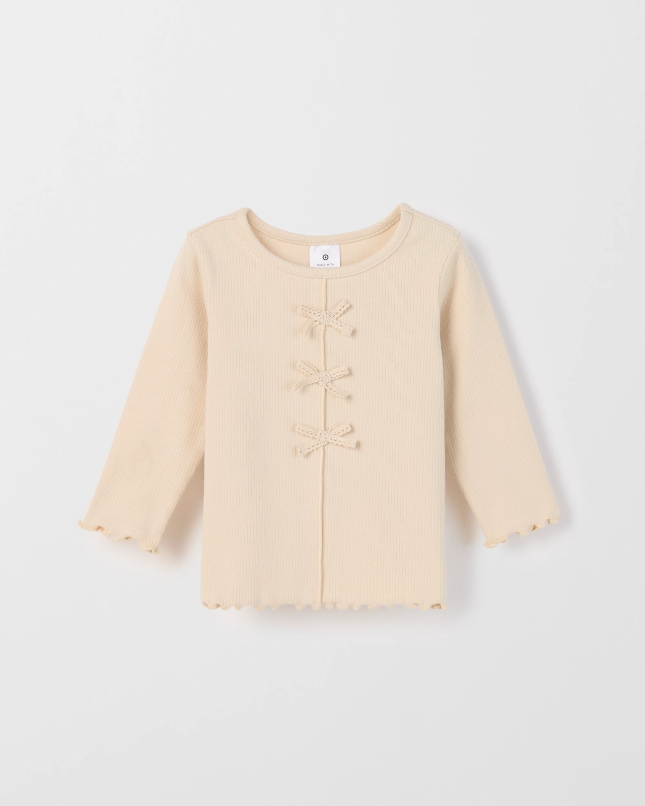 Surround your little one with ultimate comfort and sweet style in this Baby Organic Cotton Rib Bow Front T-Shirt. The ribbed texture pairs with a sueded finish for a delightfully soft feel, while just the right touch of stretch ensures easy movement during play or rest. Adorable features like the lettuce edge cuffs, gently ruffled hem and a pretty crochet bow detail add charm to any occasion. The crew neckline and regular fit provide a classic look that makes dressing simple and enjoyable. Give your baby a top that blends cosy warmth with irresistible personality—choose this T-shirt and watch them shine.