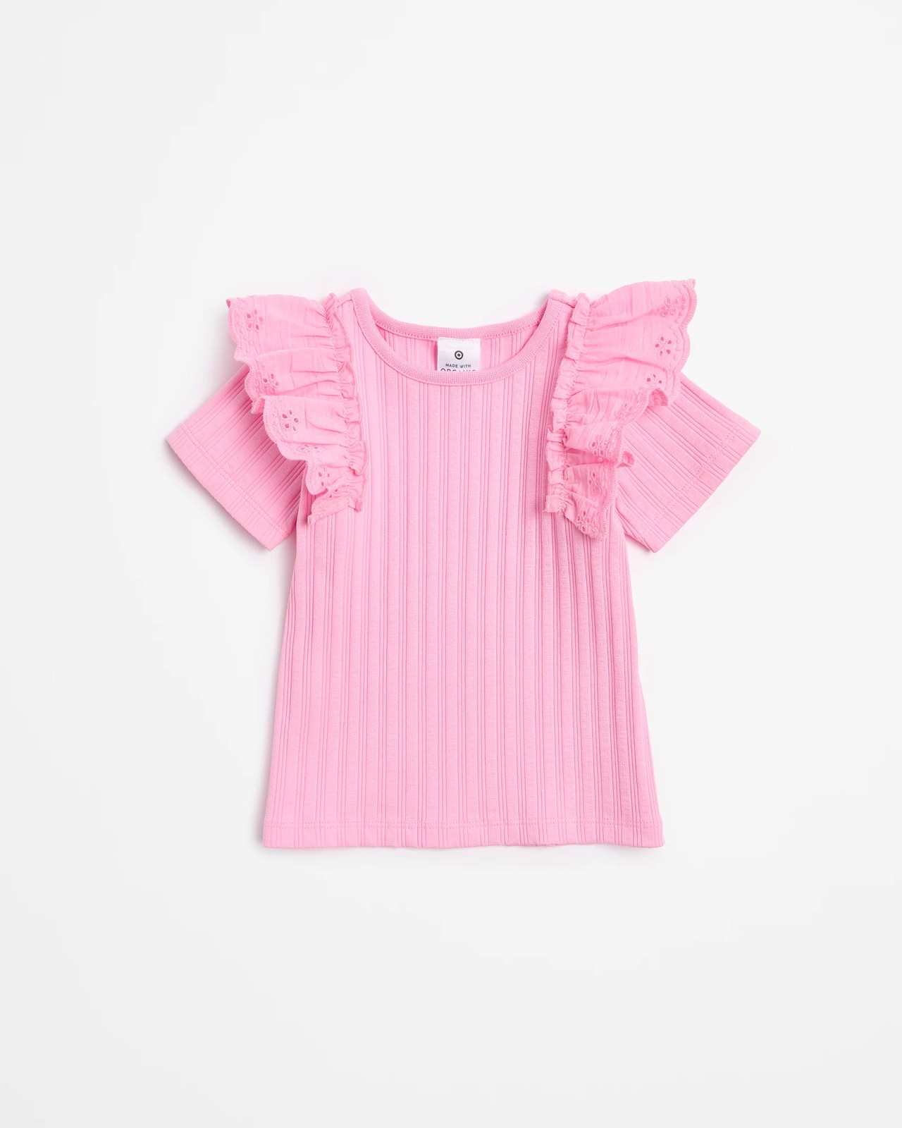 This adorable baby tee, made from soft organic cotton, offers a cosy and comfortable fit for your little one. The rib texture adds a touch of style, while the broderie frill on the shoulders makes it truly special. Ideal for all-day wear with its regular fit and short sleeves, it's perfect for playful afternoons or casual outings. Pair it with our Rib Bloomer available separately for a complete and charming look. Don't miss out on this wardrobe staple – your baby will love it!