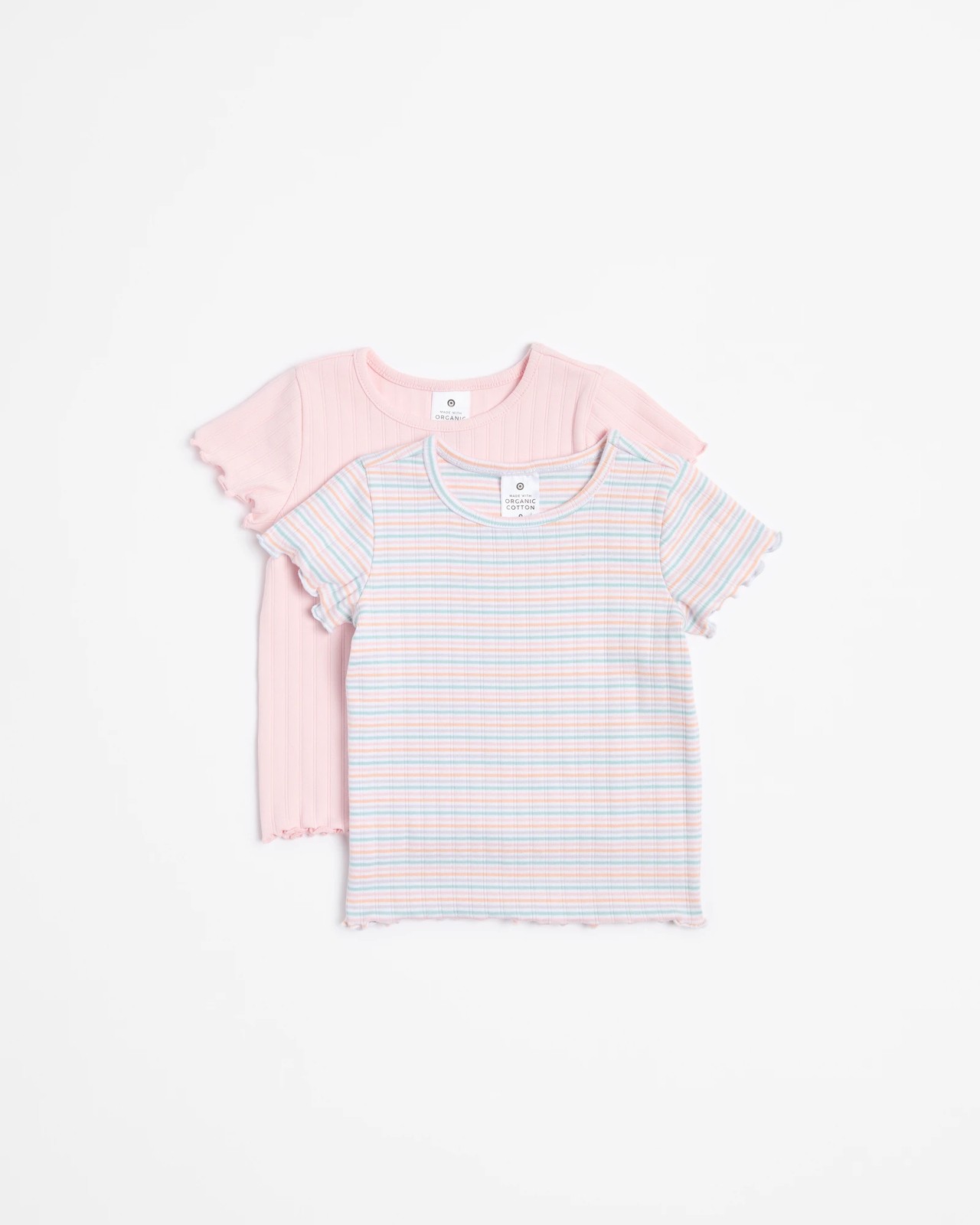 Dress your little one in our Baby Organic Cotton Rib T-shirts, perfect for daily adventures. This set includes two wonderfully soft shirts made from organic cotton, providing a comfortable and flexible fit. The ribbed texture and delicate lettuce leaf hem add a touch of charm that's both delightful and practical. Available in a variety of lovely colours and prints, these T-shirts pair seamlessly with our separately available Bike Shorts 2 pack. Get this set today to keep your baby looking adorable and feeling cosy!