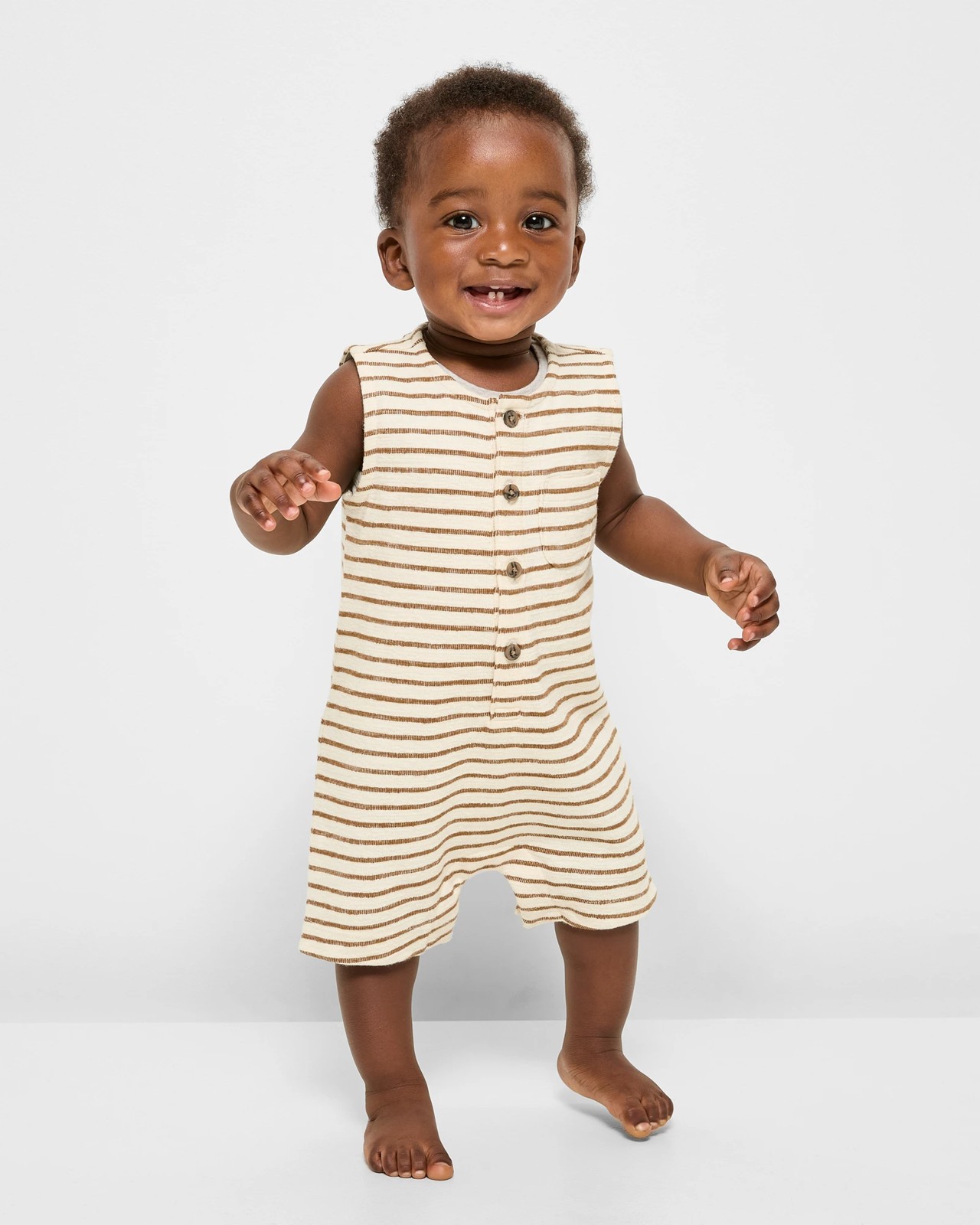 Your little one will love the comfort and style of this adorable romper. Made with soft organic cotton, it features a unique slub texture and charming stripe pattern. The sleeveless design and round neckline ensure easy dressing, while the button front and chest pockets add a practical touch. Perfect for any occasion, this romper also has press studs at the crotch for quick changes, making life easier for both baby and parents alike.