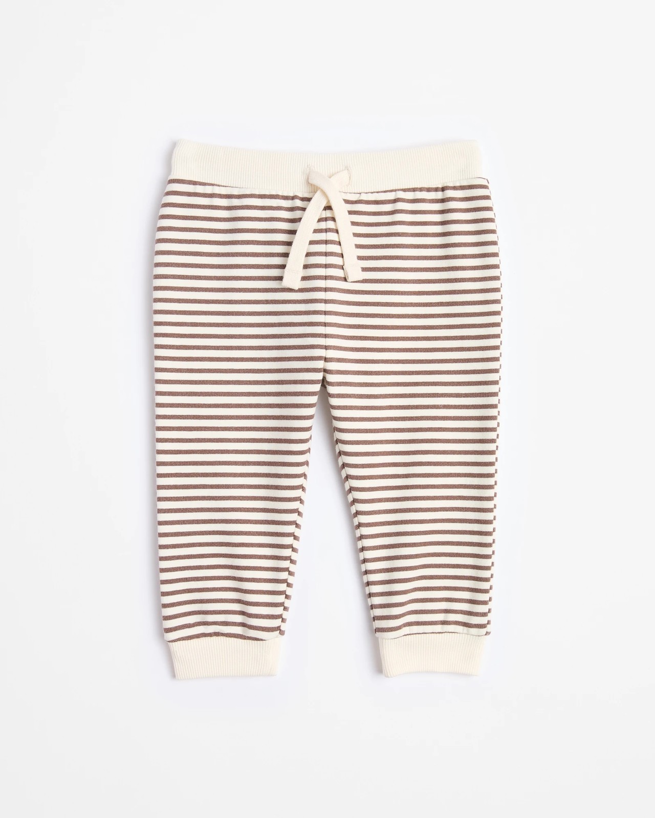 Update your little one's wardrobe with our Baby Boys Organic Cotton Stripe Trackpants. Made from soft organic cotton with a touch of stretch, these trackpants promise ultimate comfort and flexibility for your baby. The charming brown stripes give a trendy look, while the ribbed elastic waistband with drawcord ensures a secure fit during playtime. The cosy fleece lining keeps your baby warm, making these trackpants perfect for cooler days. Pair them with the matching hoodie for an adorable, coordinated outfit. Don't miss out - add these must-have trackpants to your baby's collection now!