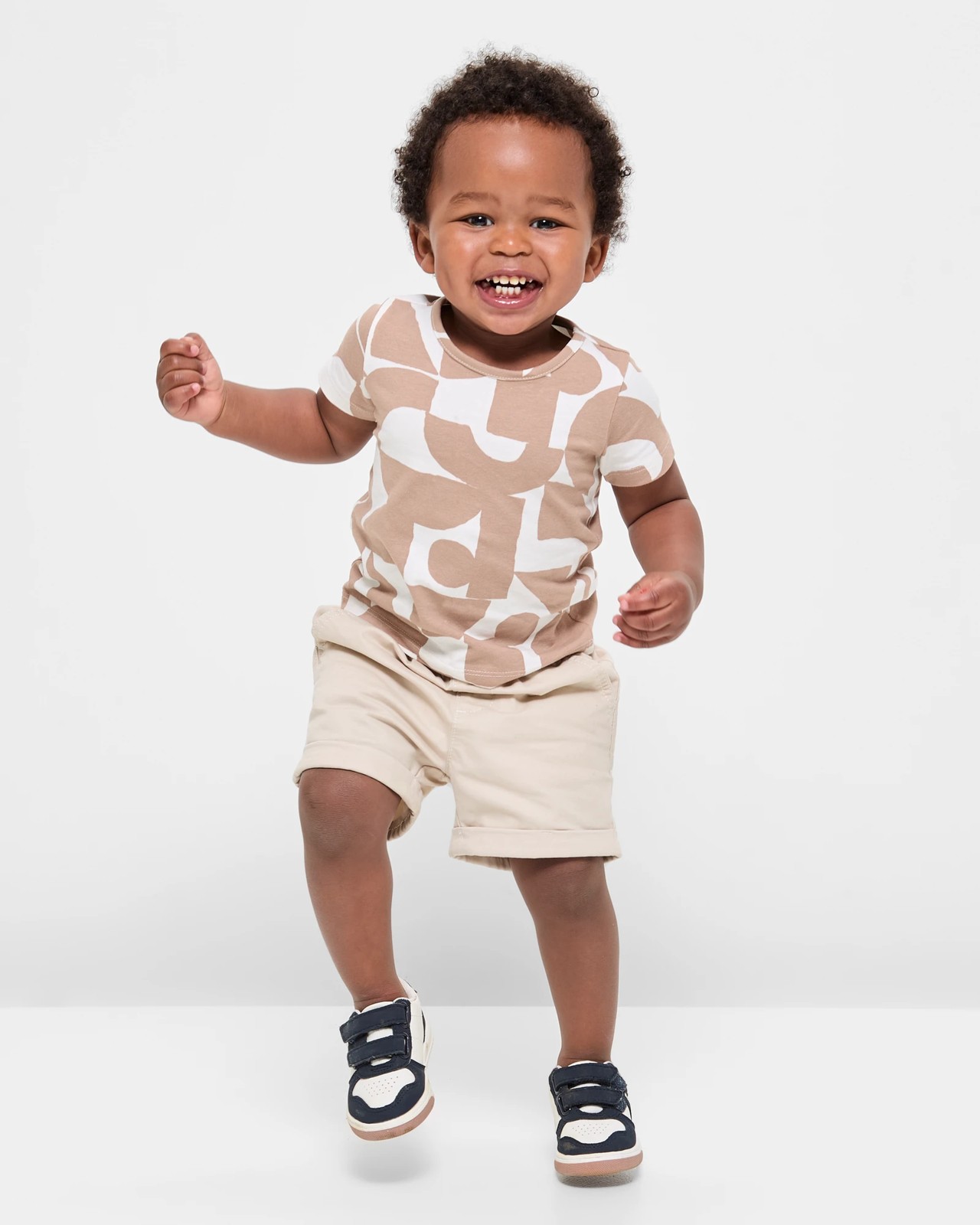Dress your little one in comfort and style with our Baby T-shirt in Almondine Shapes. This adorable short sleeve top is made from soft organic cotton, ensuring a snug feel against your baby's delicate skin. The regular fit and straight hem provide a classic look, while the crew neck adds to the cosy wearability. With a playful all-over print, this tee pairs perfectly with our matching leggings, which are sold separately. Enhance your baby's wardrobe with this charming piece. Don't miss out – order now and see your baby smile!