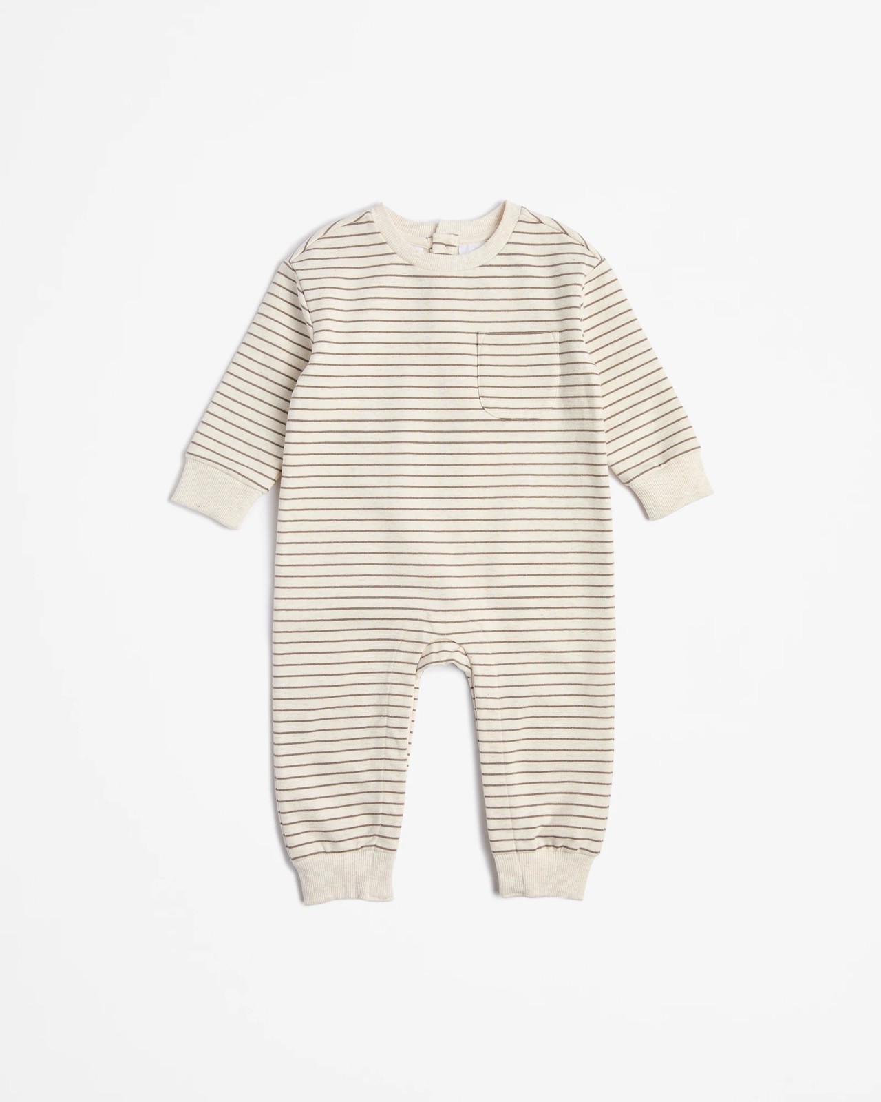 This charming baby coverall is designed with your little one's comfort in mind. Made from soft, stretchy cotton, it ensures a snug and comfortable fit. The timeless stripe print adds a classic touch, while the round neck and chest pocket provide a cute detail. Easy to dress and undress, thanks to the back neck button and press studs on the crotch, it's perfect for busy parents. The long sleeves and fleece lining will keep your baby warm and cosy. Treat your little bundle to this delightful coverall today.