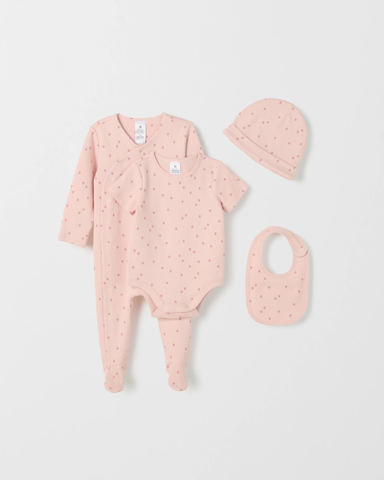Welcome your little one in comfort and style with the Baby Organic Cotton Waffle Starter Set. This thoughtfully designed four-piece bundle includes everything a new parent needs to dress baby with ease, from a cosy coverall featuring clever snap closures and mitten cuffs to a soft beanie hat and practical bib with towelling backing. Each piece boasts a gentle waffle texture, bringing added softness and charm. Made with care from organic cotton and a touch of elastane for stretch, it promises comfort without compromising on movement. With its friendly fit and adorable prints, dressing your baby is as easy as it is delightful. Prepare for those special first moments—shop this trusted starter set and ensure your baby is snug and ready for every cuddle.