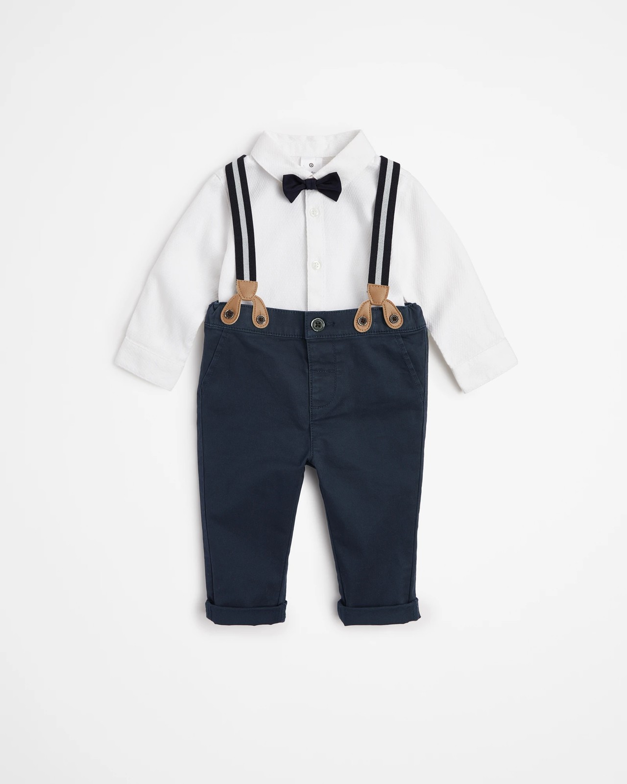 Dress your little one in style with our Baby Party Shirt and Pants Set. This charming two-piece ensemble includes a cotton-rich, collared shirt adorned with a sewn-in bow tie and paired with navy blue chino pants. The shirt features long sleeves with buttoned cuffs and a chic curved hem, ensuring your baby looks dapper for any occasion. Completing the look are adjustable, detachable striped braces that add a touch of flair. Perfect for special events or family gatherings, this set is designed for comfort as well as style. Order now!