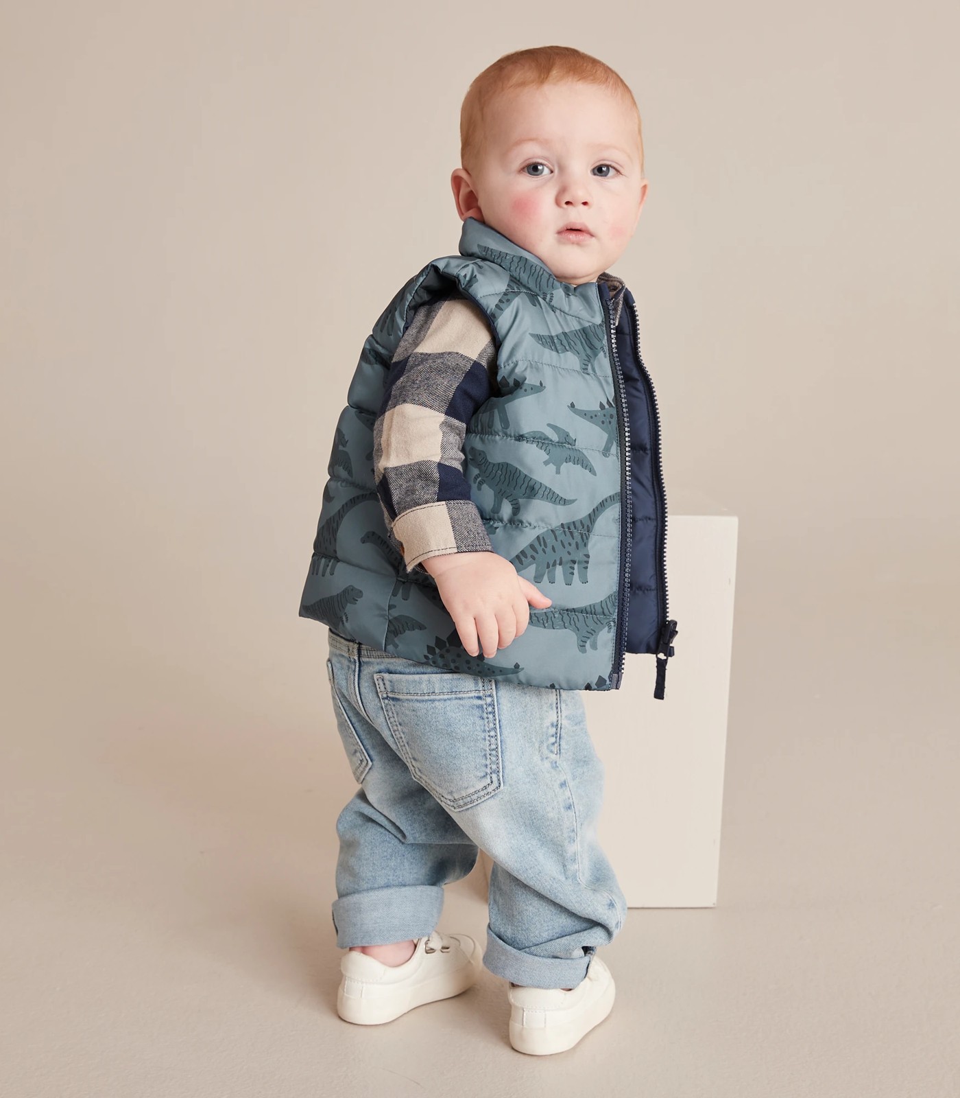 A great addition to bubs wardrobe this season comes the Baby Reversible Recycled Puffer Vest, featuring a padded body, full zip front, is reversible, shower resistant and crafted from recycled materials.