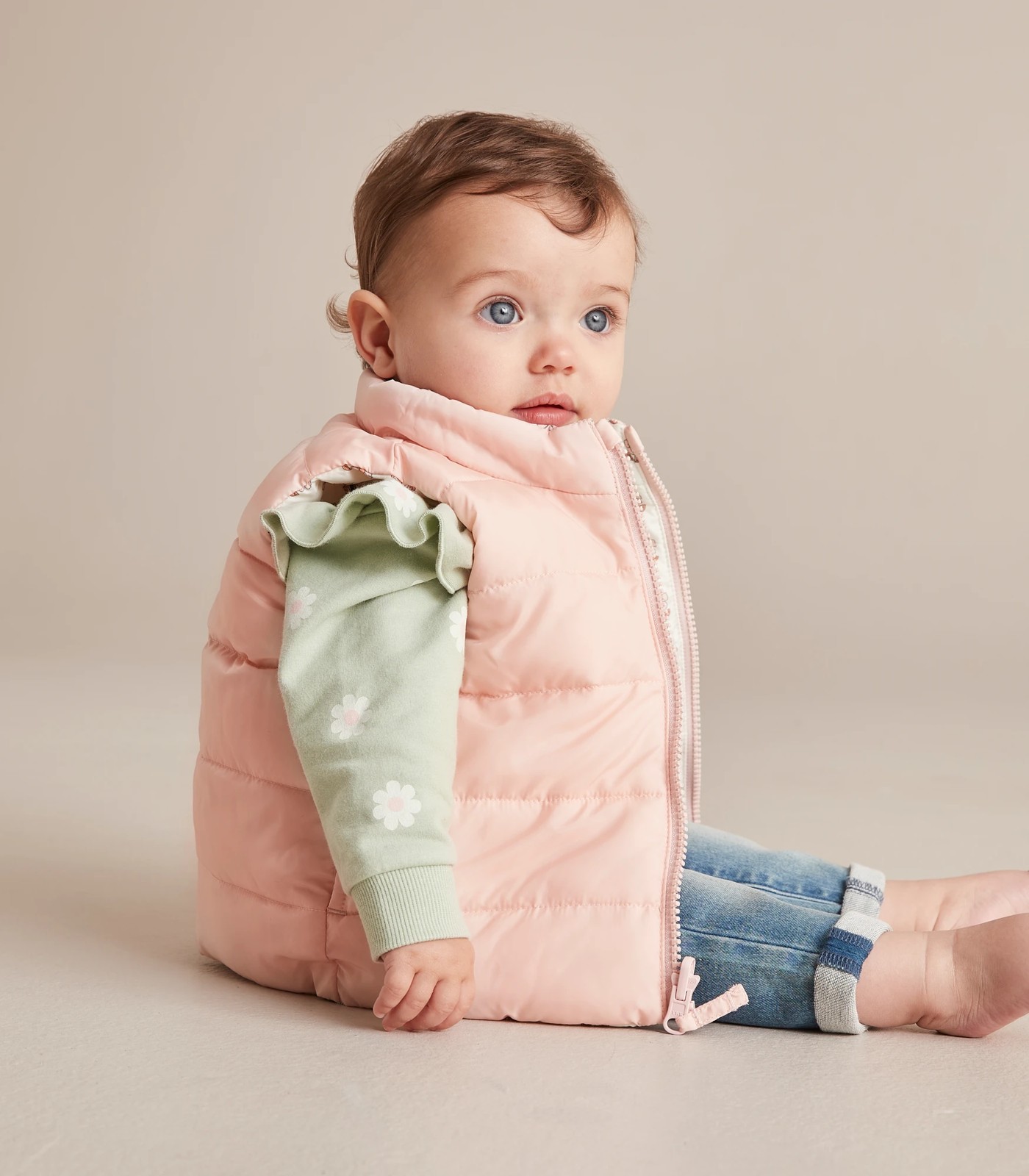 A great addition to bubs wardrobe this season comes the Baby Reversible Recycled Puffer Vest, featuring a padded body, full zip front, is reversible, shower resistant and crafted from recycled materials.