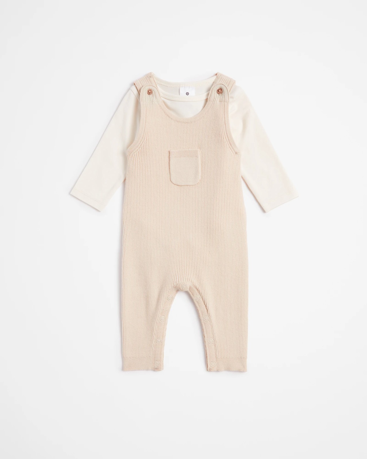 Indulge your little one with the Baby Rib Knit Overall 2 Piece Set. Crafted from a luxurious blend of viscose, poly, and nylon, this set promises both comfort and style. The classic overall design boasts buttoned shoulder straps and press studs between the legs for easy dressing. The matching basic cream long sleeve top adds the perfect finishing touch. Your baby will love the freedom of movement and you'll adore the adorable look. Treat your little bundle of joy to this delightful set today.