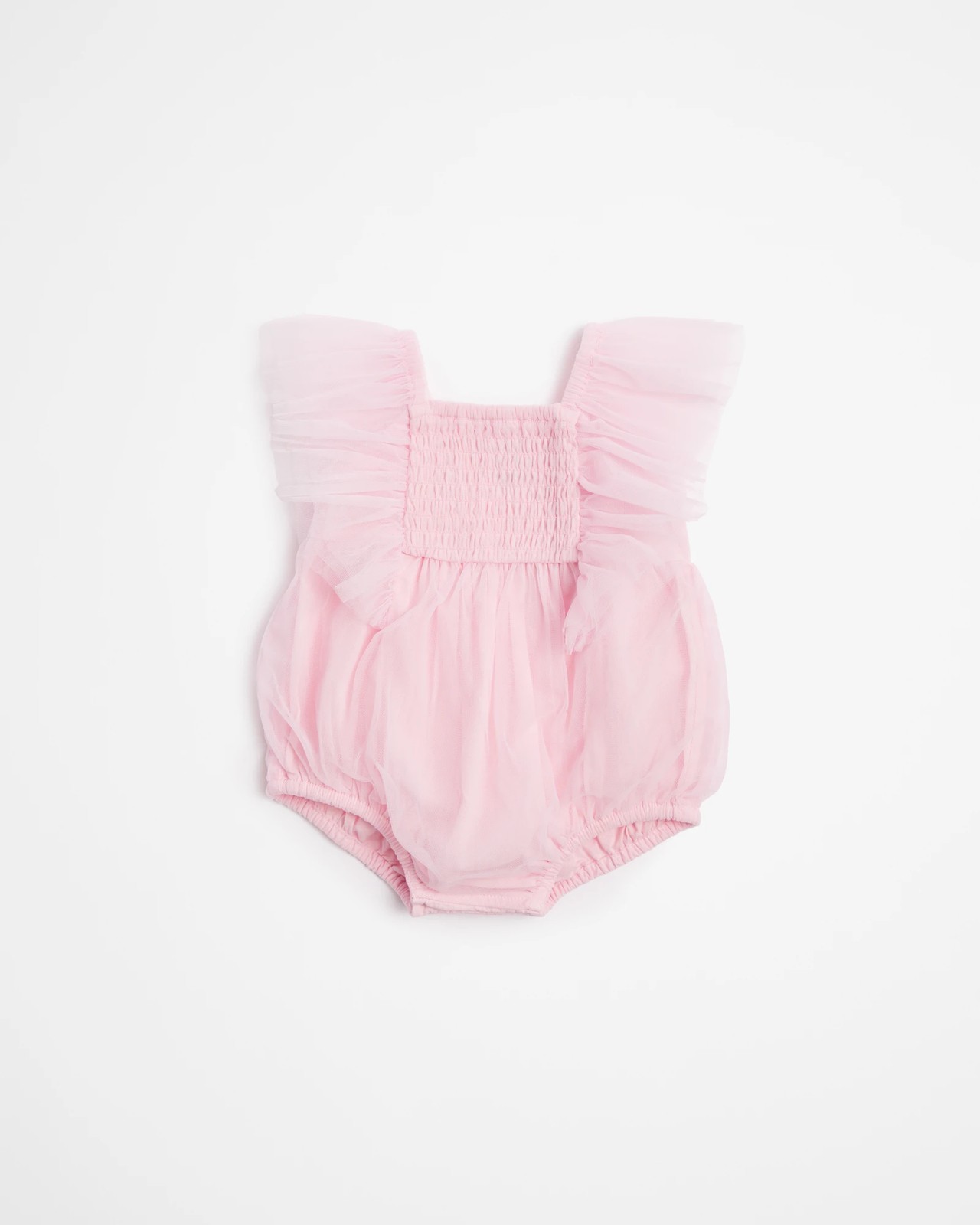 This stylish boysuit features a regular fit with square neck and sleeveless design, plus a ruffle trim at the armholes. The top is finished with a ruched detail, and the body is crafted from soft tulle for a sweet look. With its soft pink color, it's perfect for any celebration!
