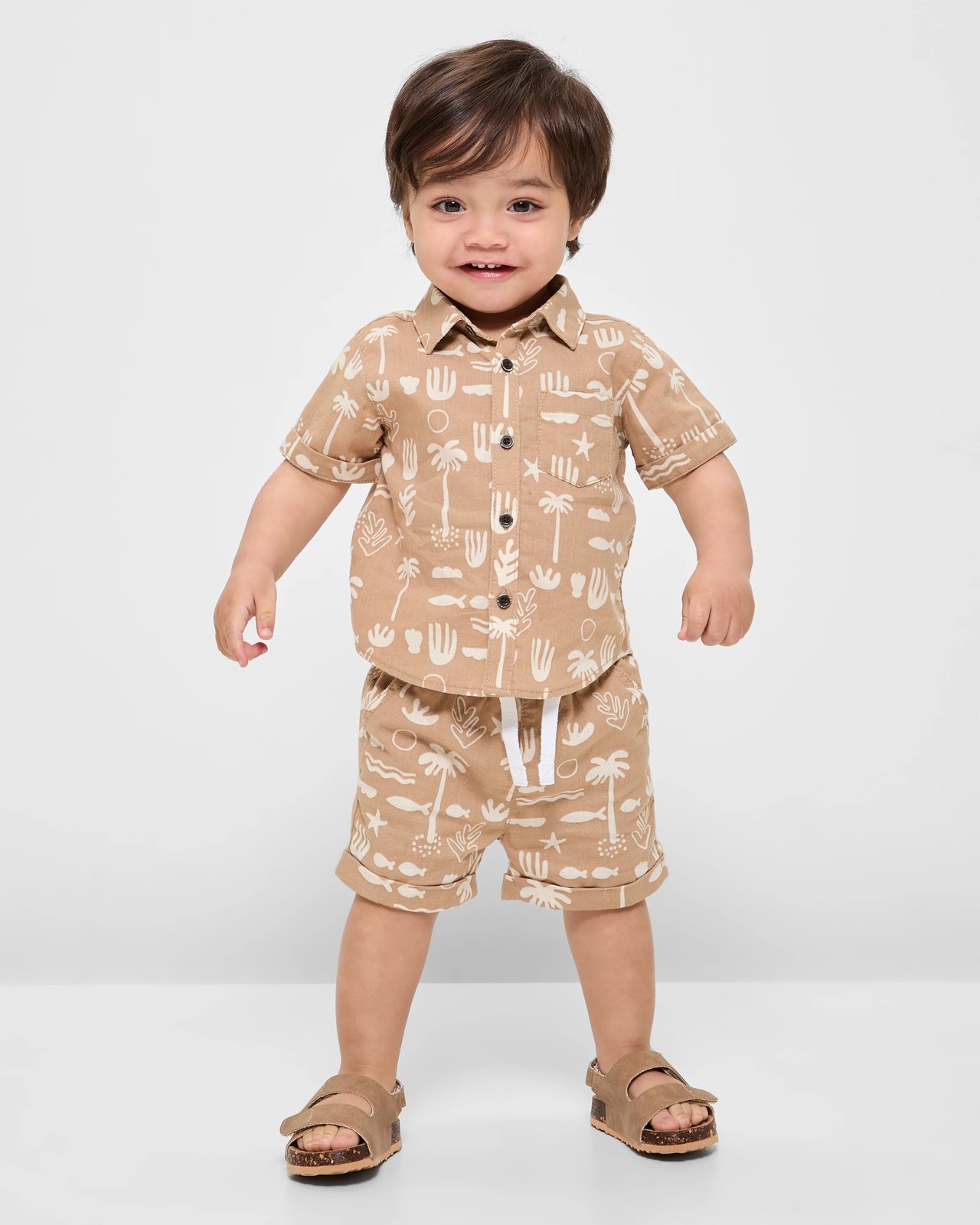 Dress your little one in style with our delightful Baby Shirt and Short Set. This 2 piece ensemble features a breezy cotton-linen blend, ensuring comfort and ease for your baby. The charming shirt with an all over palm tree print and button-down front, paired with matching shorts with an elastic waistband, combines fun and practicality. Complete with thoughtful details like a single chest pocket and turned cuffs, this set is perfect for any adventure. Add this adorable set to your baby's wardrobe today!