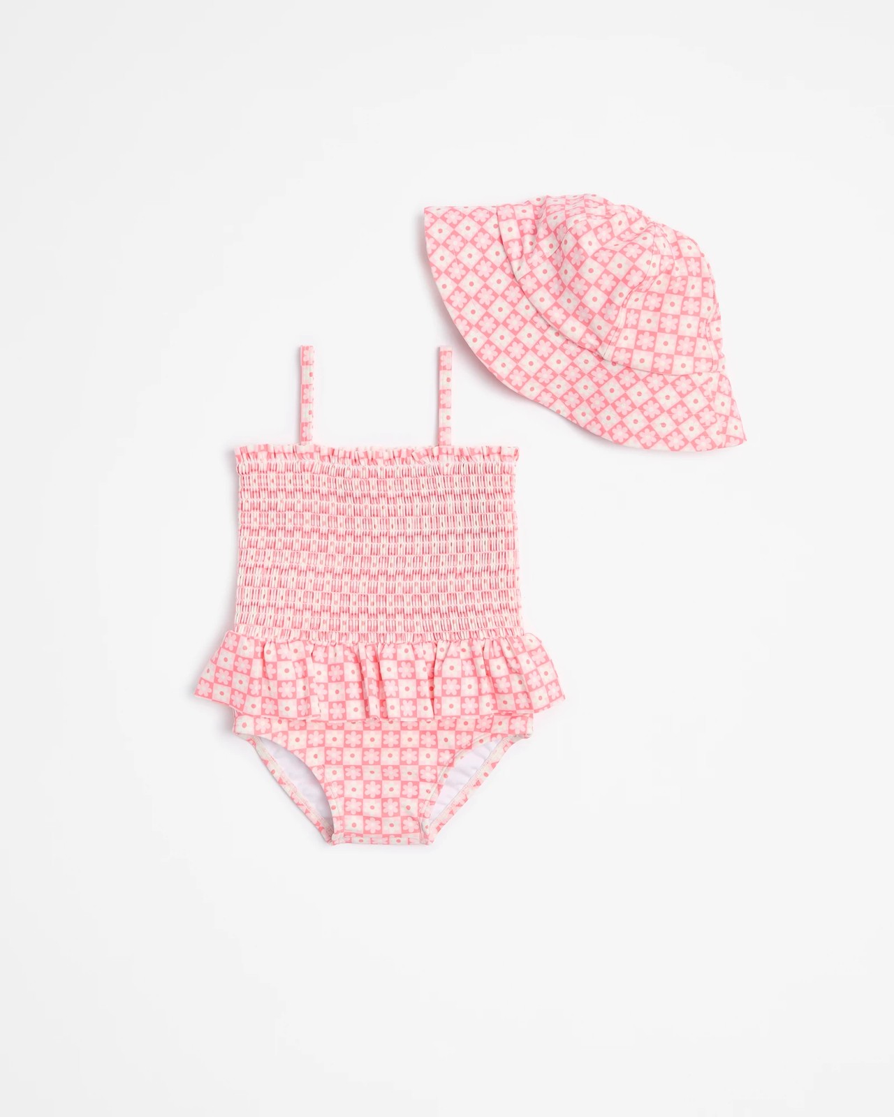 Discover endless summer fun with our cute baby swimsuit and matching hat set. Provide your little one with protection thanks to UPF 50+ fabric, while its great stretch ensures perfect comfort. Featuring an adorable all-over print and tailored with charming ruffles and ruching, this fully lined two-piece set promises both style and comfort. Make every beach day special; grab this must-have swimming outfit today!