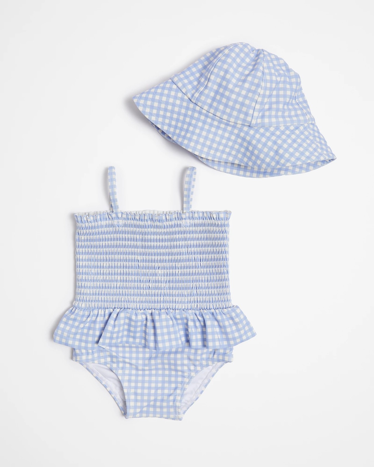 Crafted using recycled materials, it provides UPF 50+ sun protection and great stretch for all-day comfort. The 2 piece set features an all over print strappy one piece swimsuit with ruffle and ruched detailing, fully lined for added comfort. It also comes with a matching brimmed hat for extra protection against the sun. Your little one will be ready to take on the waves in this adorable swim set!