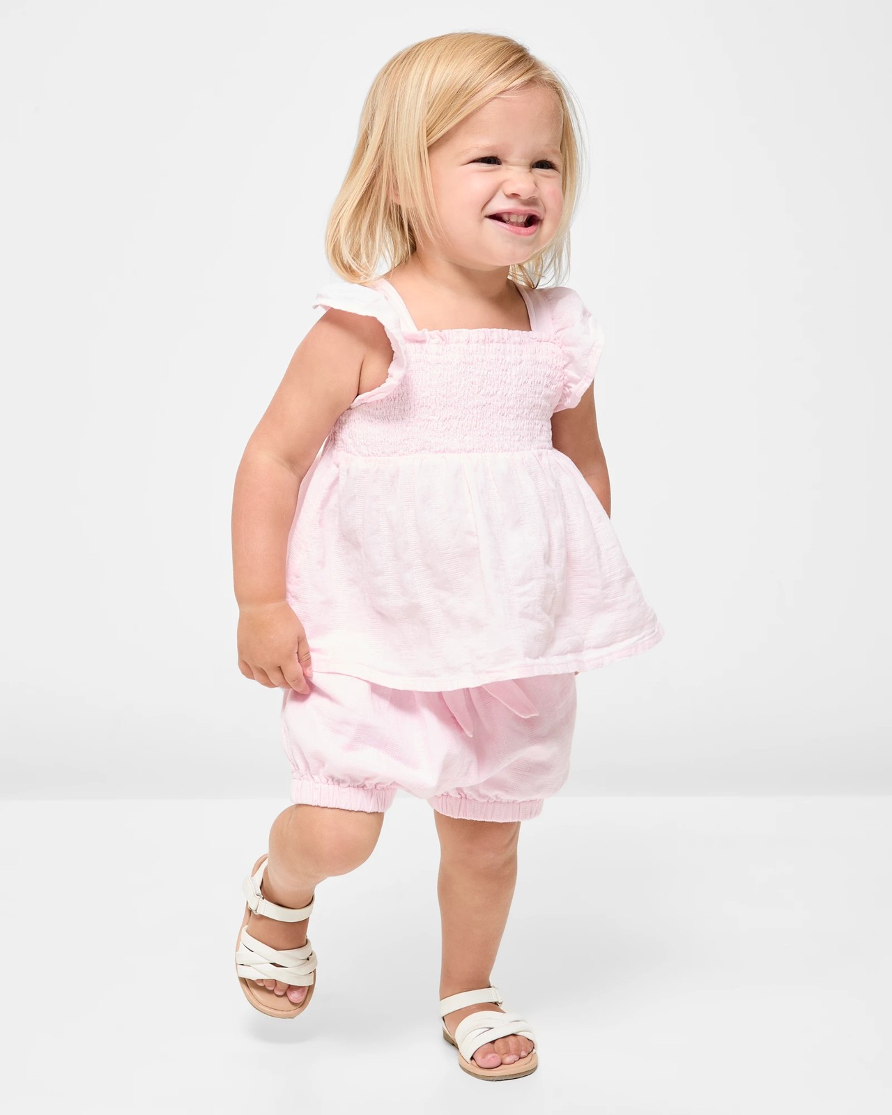 Dress your little one in this charming baby top, designed for comfort and style. Made from a rich cotton blend, it offers a regular fit with a square neckline and a ruched chest for added charm. The sleeveless design features delicate ruffle details and a textured stripe pattern, ensuring your child stays cool and fashionable. The elastic back waistband and pinafore button-down crossover back make it easy to adjust for a perfect fit. Pair it with the matching shorts, available separately, for an adorable complete outfit. Make this lovely piece a part of your baby's wardrobe today!