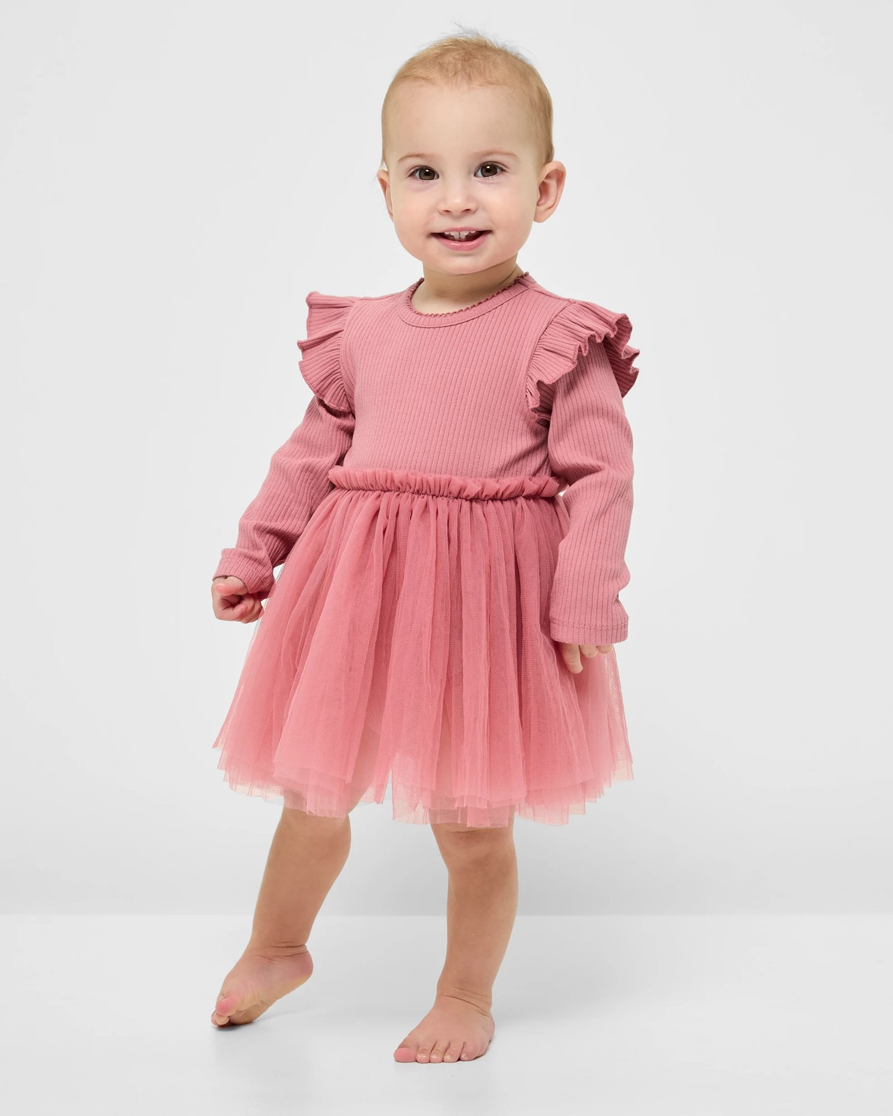 Introduce a touch of whimsy to your baby's wardrobe with our charming Baby Tutu Dress. Made from soft cotton with a hint of stretch, this bodysuit ensures a comfortable fit for your little one. The classic round neck, adorned with delicate scallop trim, and the ribbed texture provide a delightful finishing touch. Long sleeves with subtle ruffle shoulder trims blend seamlessly with an attached tutu overlay skirt, presenting a sweet, layered look. Practical press studs at the crotch make changing hassle-free. Perfect for special occasions or everyday wear, this dress is a must-have. Make your little darling the star of the day.