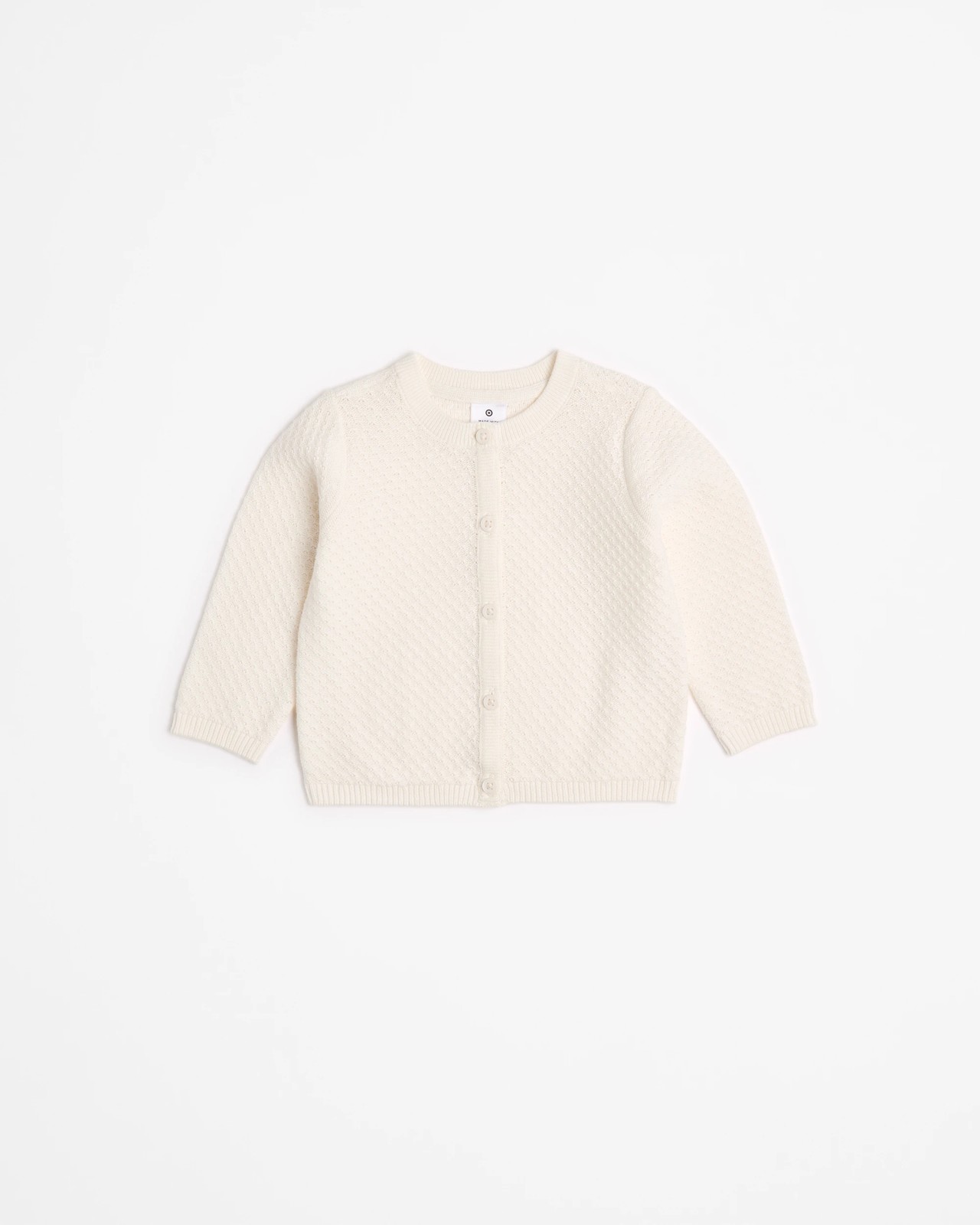 Keep your little one cosy and comfortable with this adorable baby cardigan, made from gentle organic cotton that feels soft against delicate skin. Featuring a charming pointelle knit texture, this piece brings a classic touch to any outfit. The round neckline and easy button-down front allow for hassle-free dressing, while the long sleeves and straight hem provide a snug fit. The rib edge finish completes the look with subtle detailing. Whether layered over a favourite outfit or worn on its own, this cardigan is a delightful addition to your baby's everyday wardrobe. Discover the perfect blend of comfort and style for your child now.