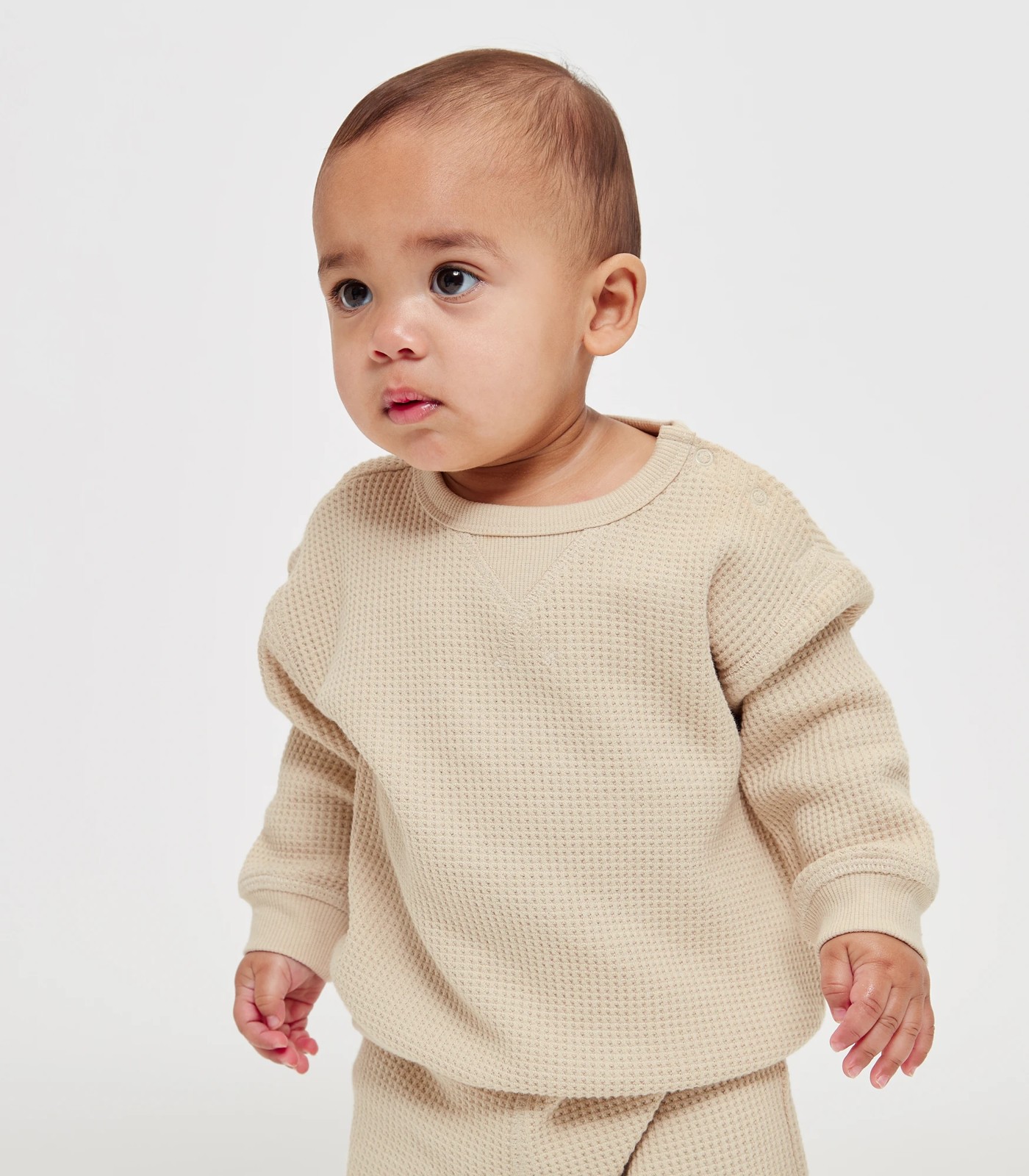 Dress your little one in soft cotton with our Snug Baby Waffle Jumper. This delightful jumper features a cosy waffle knit design and a regular fit for easy movement. The ribbed crew neck with press studs makes dressing a breeze, while the long sleeves and straight ribbed hem offer comfort and warmth. Complete the outfit with our matching Trackpants, available separately. Bring warmth and style to your baby's wardrobe today!