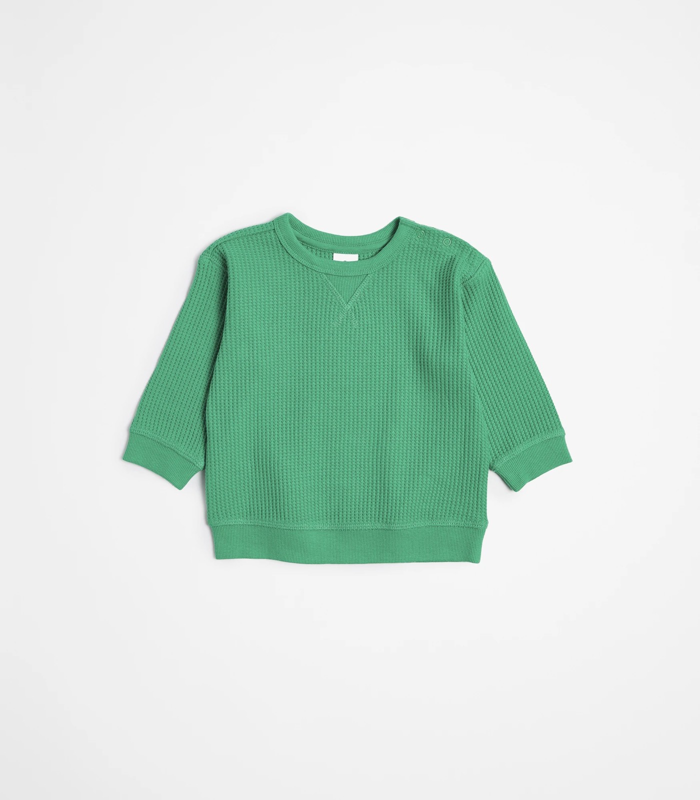 Introducing the Baby Waffle Jumper, a must-have addition to every little one's wardrobe. This jumper is made from a soft and cosy cotton-rich waffle knit, ensuring maximum comfort. The ribbed crew neck and convenient press studs on the shoulder make changing a breeze. With its regular fit, long sleeves, and ribbed cuffs, this jumper is perfect for keeping your baby warm during cooler days. The straight ribbed hem adds a stylish touch to the overall look. Complete the outfit with the matching Trackpants, available separately. Upgrade your baby's style and warmth with the Baby Waffle Jumper today!