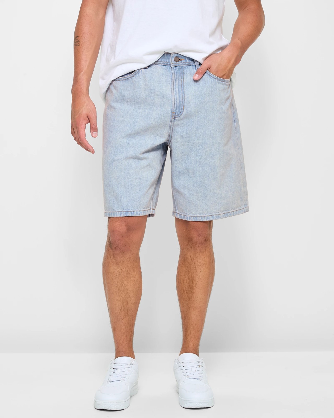 Discover the perfect blend of comfort and style with our Baggy Denim Shorts from Commons. These shorts are meticulously tailored from a soft cotton blend to provide a stretchy, comfortable fit that keeps you feeling relaxed all day. Featuring a stylish light blue denim with unique leather-look patches and embossing, these shorts are a fashion statement on their own. Complete with a structured waistband, belt loops, and a classic button and zip closure, these shorts offer a versatile option suitable for any occasion. Add a touch of flair to your wardrobe with these effortlessly cool denim shorts.