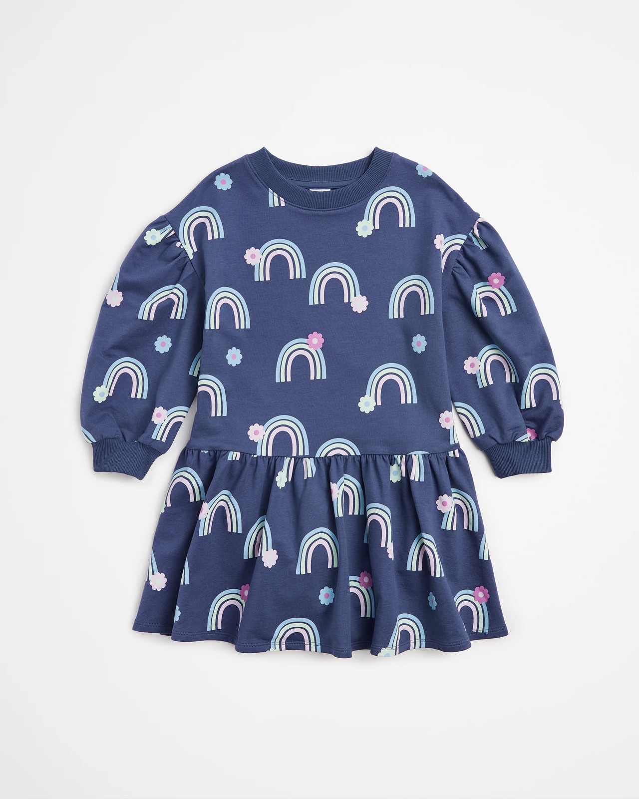Introducing our charming Balloon Sleeve Jumper Dress. Made with the finest quality cotton and a touch of stretch, this dress offers both comfort and style for your little girl. The dress features a regular fit and an all-over print that adds a playful touch to her wardrobe. With a ribbed crew neck and long balloon sleeves with ribbed cuffs, it's designed to keep her warm and cosy. The gathered drop hem adds a feminine flair to the dress, making it perfect for any occasion. Treat your little princess to this adorable dress today!
