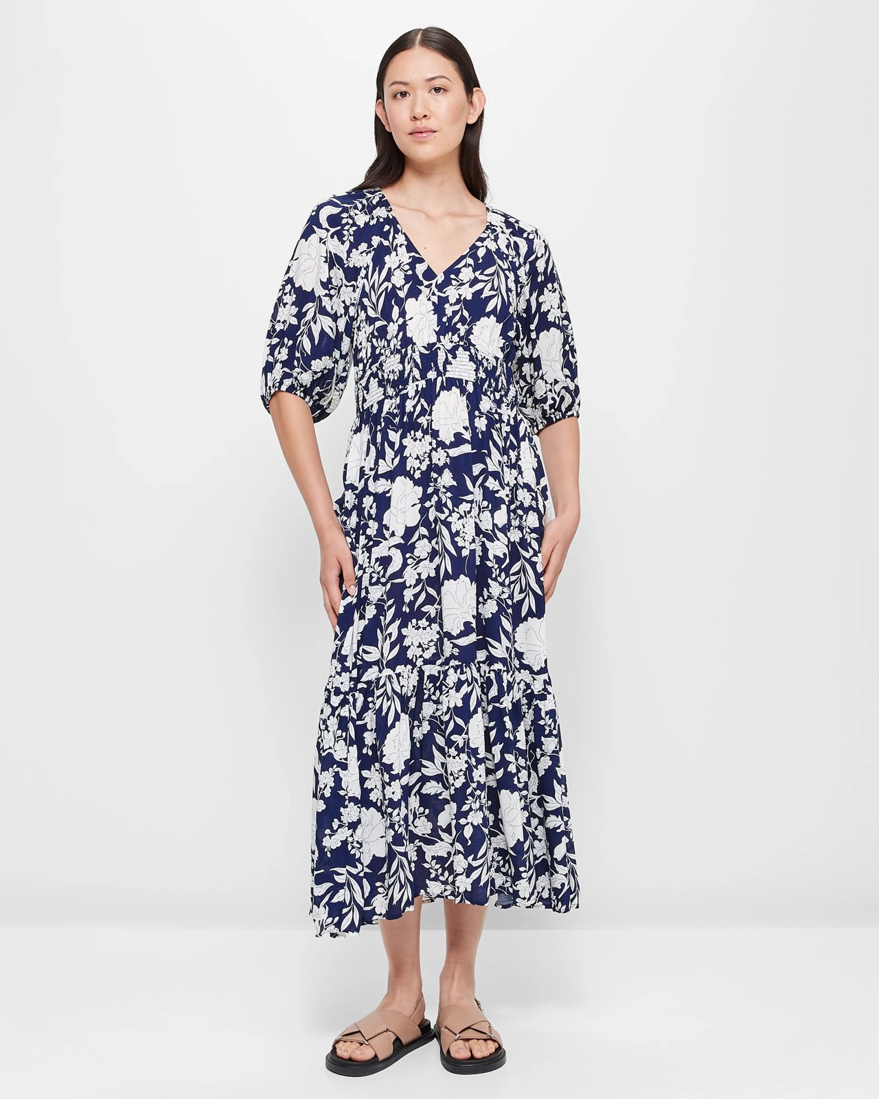Introducing our stylish Balloon Sleeve V-Neck Maxi Dress for women. Made from a soft and lightweight viscose fabrication, this dress offers ultimate comfort. Its regular fit and V-neckline add a touch of elegance to any occasion. The dress features elastic gathering around the shoulders and back, along with short puff sleeves with elastic cuffs, giving it a trendy look. The shirred elastic waistband provides a flattering silhouette, while the tiered bottom panel adds a playful feel. With its straight hemline and maxi length, this dress is perfect for both casual outings and special events. Get ready to turn heads and make a statement with this must-have dress!