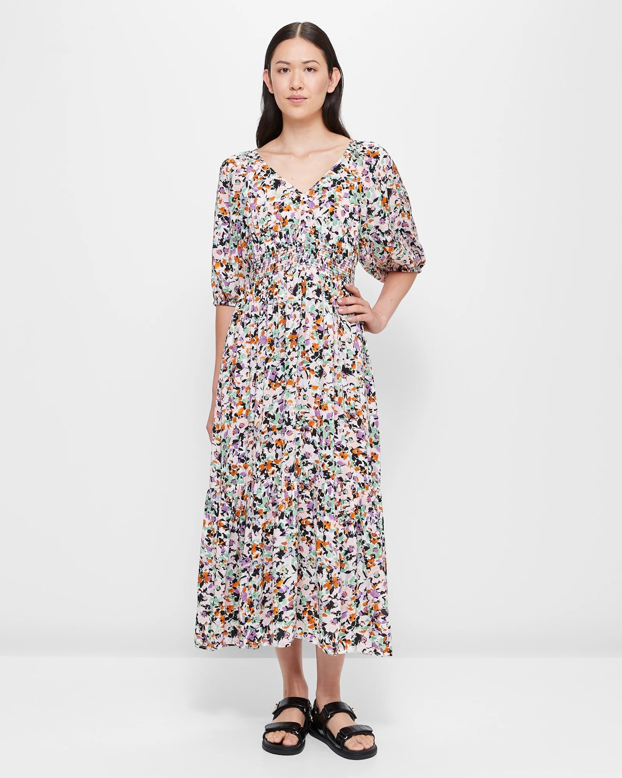 Introducing our stylish Balloon Sleeve V-Neck Maxi Dress for women. Made from a soft and lightweight viscose fabrication, this dress offers ultimate comfort. Its regular fit and V-neckline add a touch of elegance to any occasion. The dress features elastic gathering around the shoulders and back, along with short puff sleeves with elastic cuffs, giving it a trendy look. The shirred elastic waistband provides a flattering silhouette, while the tiered bottom panel adds a playful feel. With its straight hemline and maxi length, this dress is perfect for both casual outings and special events. Get ready to turn heads and make a statement with this must-have dress!