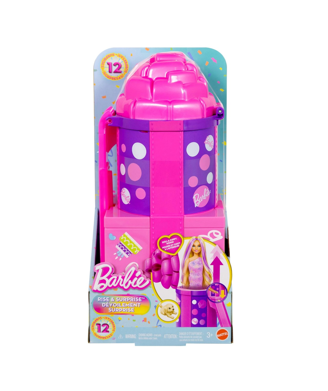With 12 surprises in one package, Barbie Rise & Surprise doll delivers a unique reveal experience with gift box-inspired packaging and pet birthday-themed fun! Open the present and watch as Barbie pops out of the stack! The slide pops out next surprise! Pet puppy is ready for a ride! Surprise bags reveal even more fun with party fashions, dress-up accessories and sweet party treats. More surprises include colour-change on the doll's hair -- simply use icy cold and warm water to transform, change back and repeat again and again! Join the party with Barbie Rise & Surprise doll. Each doll sold separately, subject to availability. Dolls cannot stand alone. Colours and decorations may vary.