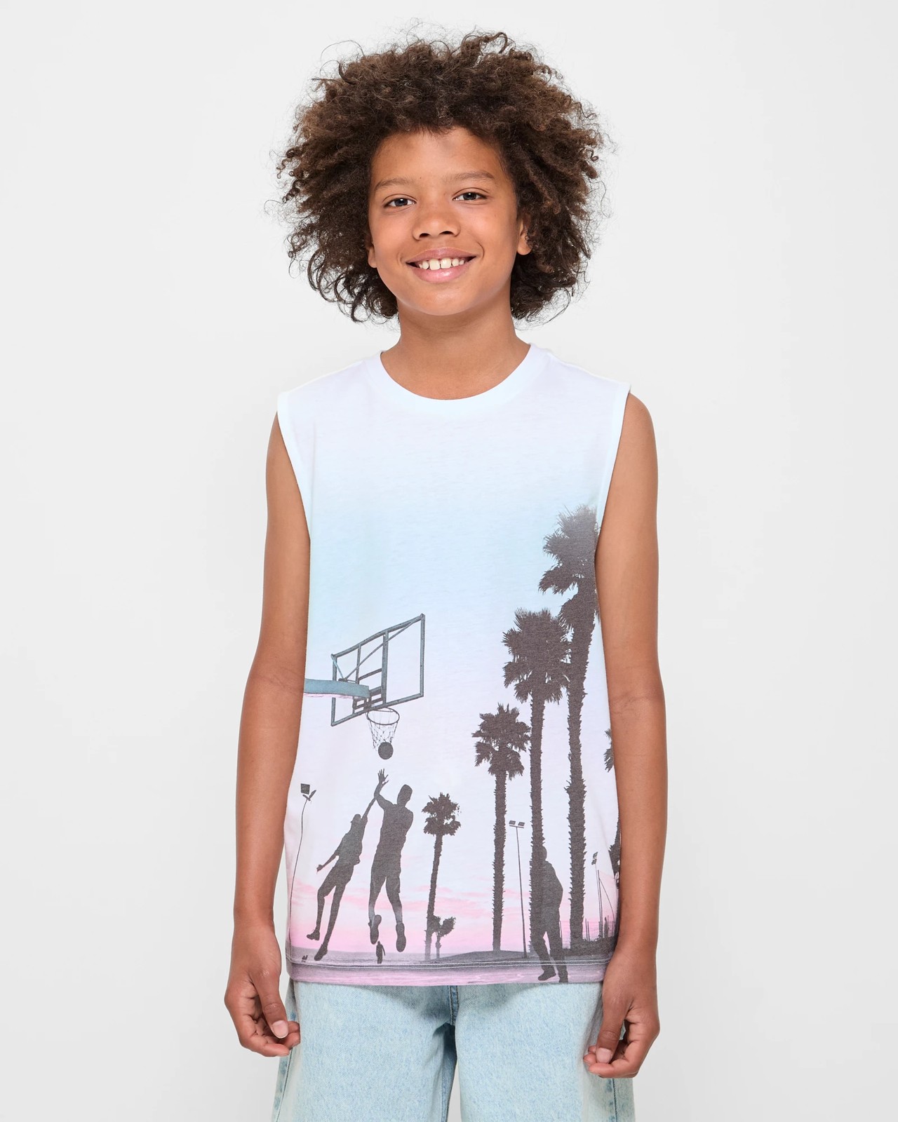 Dive into comfort and style with our Basketball Print Tank. This boys' tank features a captivating basketball photo print on the front, making it perfect for sporty days out or casual play. Designed for a regular fit with a classic crew neck and sleeveless design, it's easy to layer for any season. Whether it's a game day or a visit to the park, this tank will quickly become his go-to. Get ready to level up his wardrobe with this must-have look!