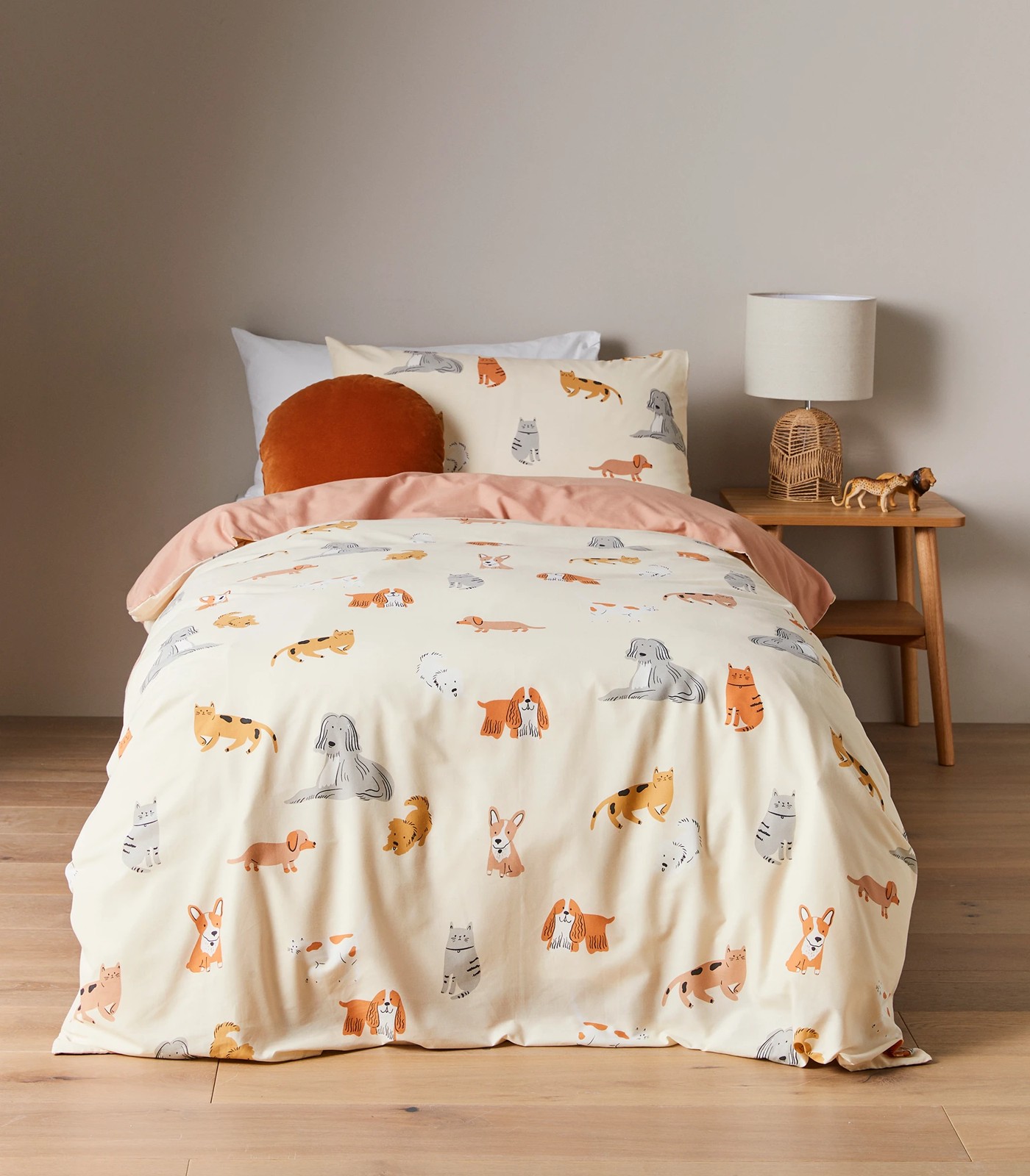 Sleep comfortably from night until morning with the Baylee Paws Quilt Cover Set. This gorgeous set features an adorable animal print with cats and different types of dogs; sausage dogs, corgis, terriers and more! Crafted from cotton/polyester and packaged in a matching fabric bag, it's a great choice for your bedroom or your kids' bedroom.