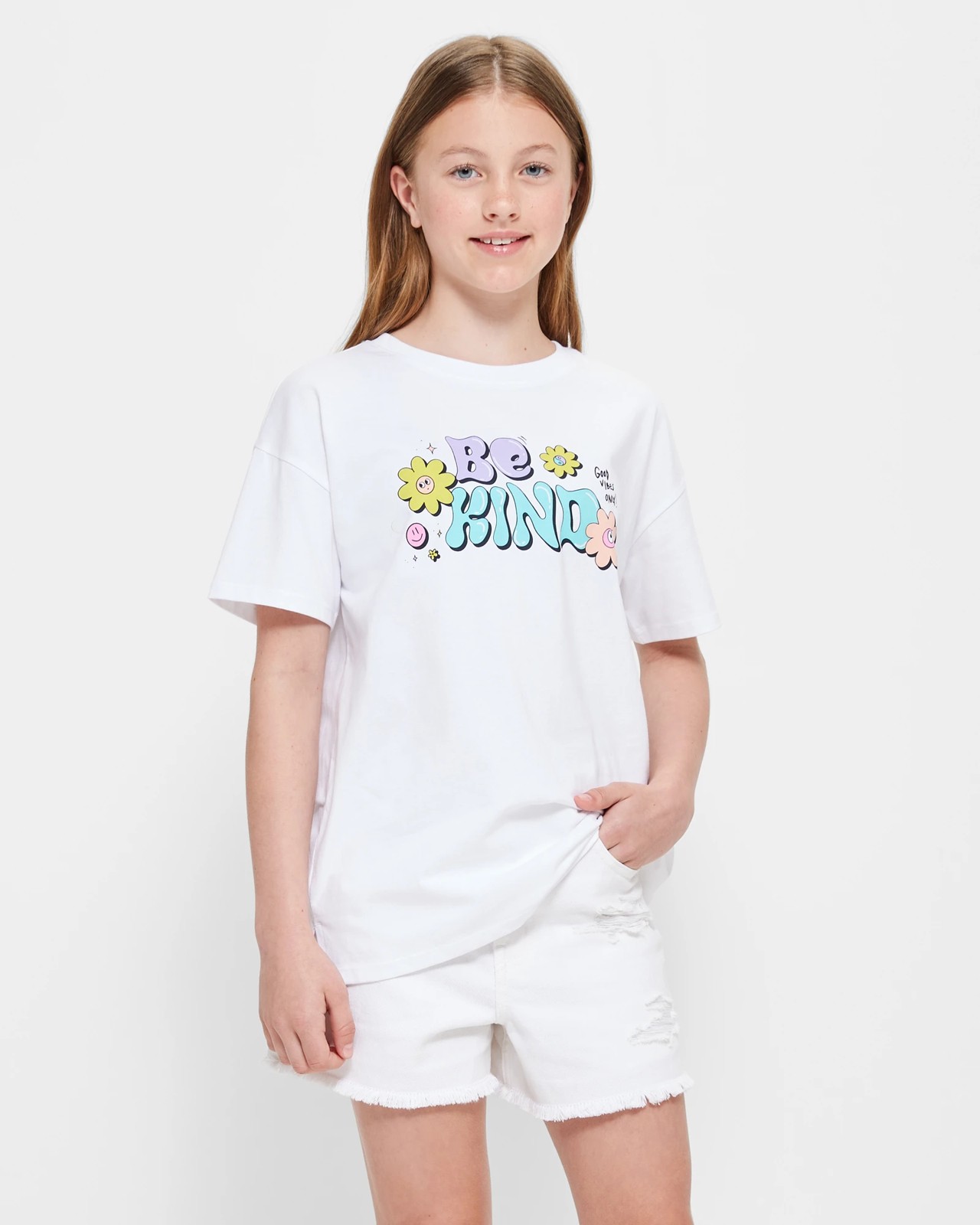 Bring some positive vibes to their wardrobe with this Be Kind Graphic Longline T-shirt. Crafted from a cotton-rich fabric for a soft and comfortable wear, this longline fit t-shirt boasts a ribbed crew neck, short sleeves and straight hem with side splits. With a bold 'Be Kind' print to the front and large print to the back, this stylish t-shirt is sure to become an instant favorite in any little girl's wardrobe.