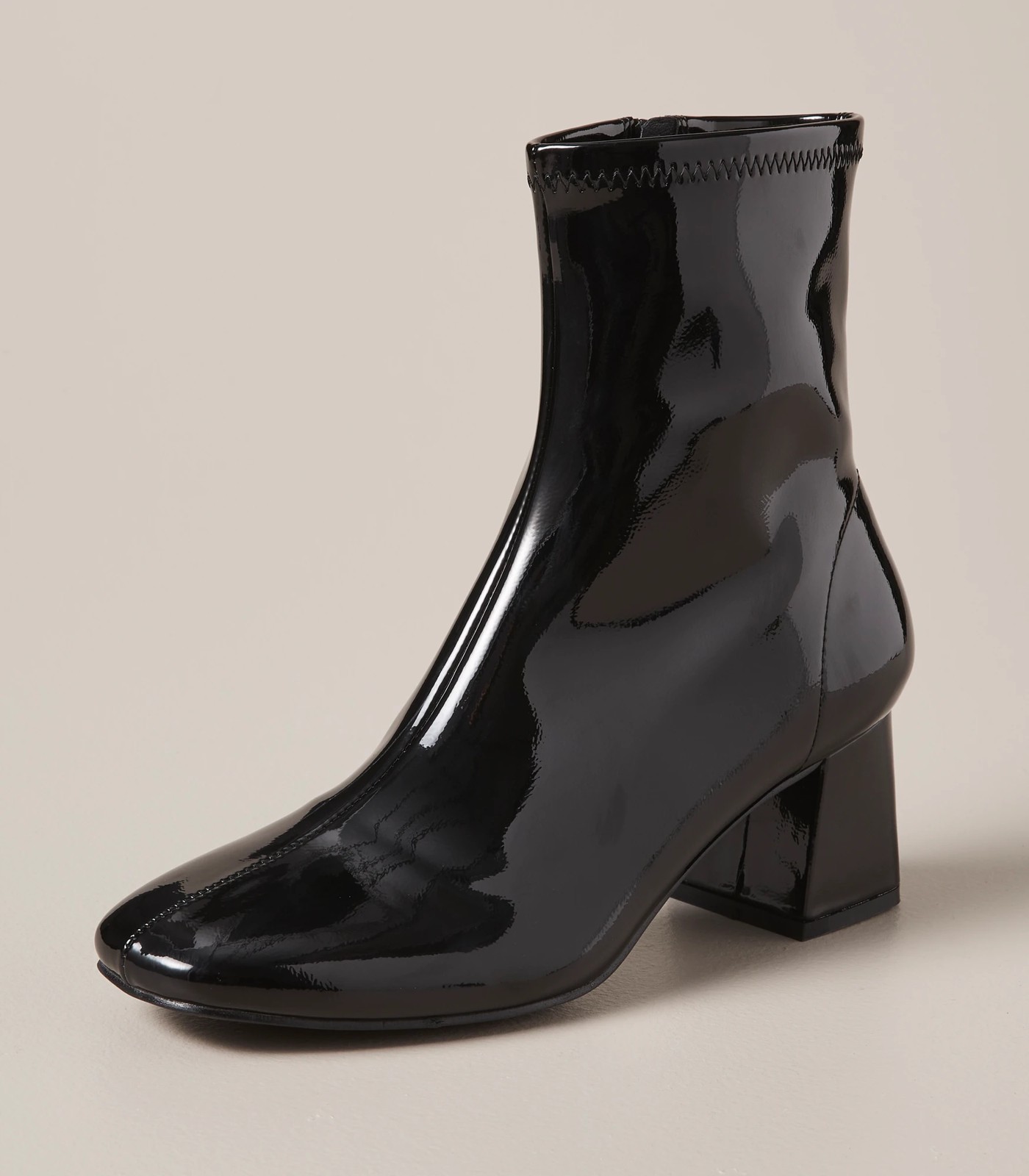 Stylish and great for everyday wear, the Bentley patent heeled ankle sock boots have a lush shiny outer, an inner-side zip up for easy pull on and off, great ankle coverage with a stretch ankle sock design and a square toe.