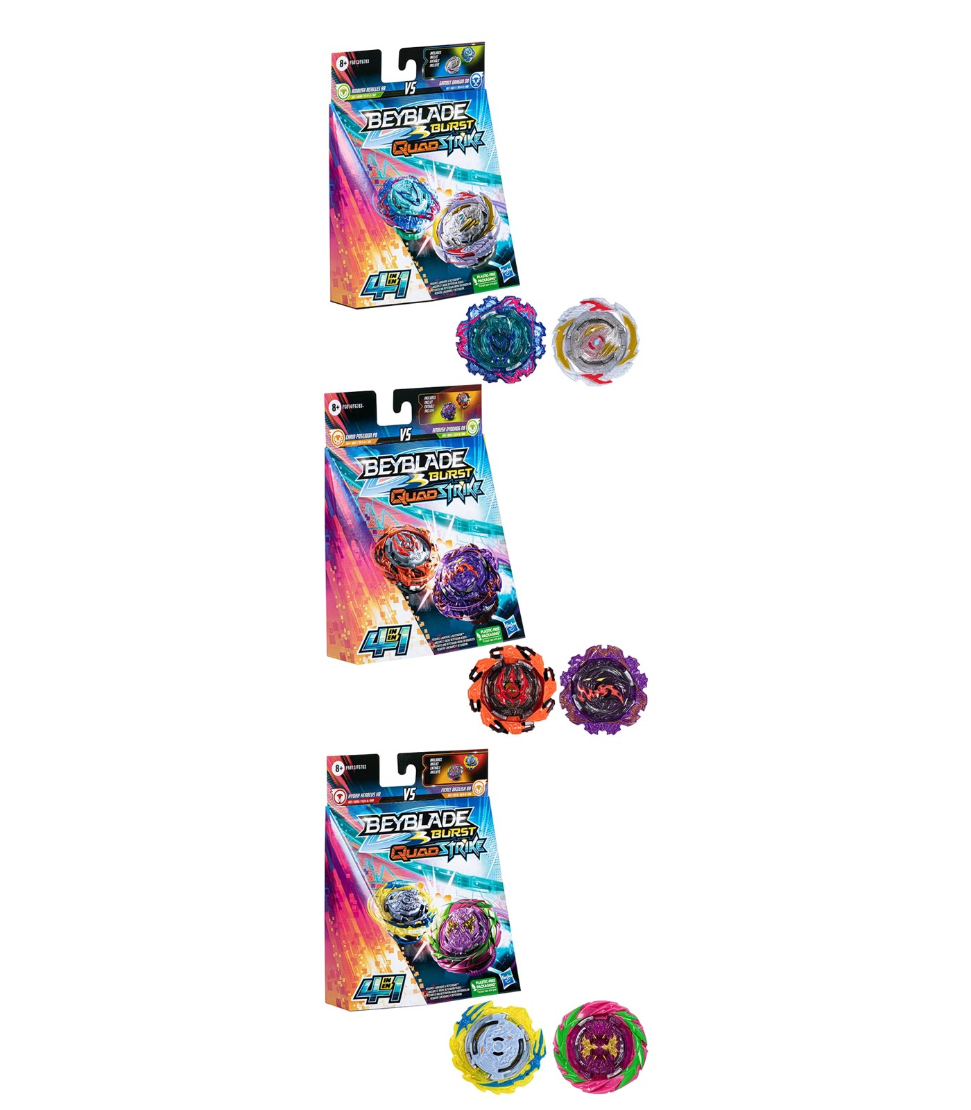 Unleash the energy of QuadStrike tech in the QuadStrike Beystadium (Beystadium and launchers sold separately, subject to availability). Scan code on tops to unleash your top in a virtual battle in the Beyblade Burst app!