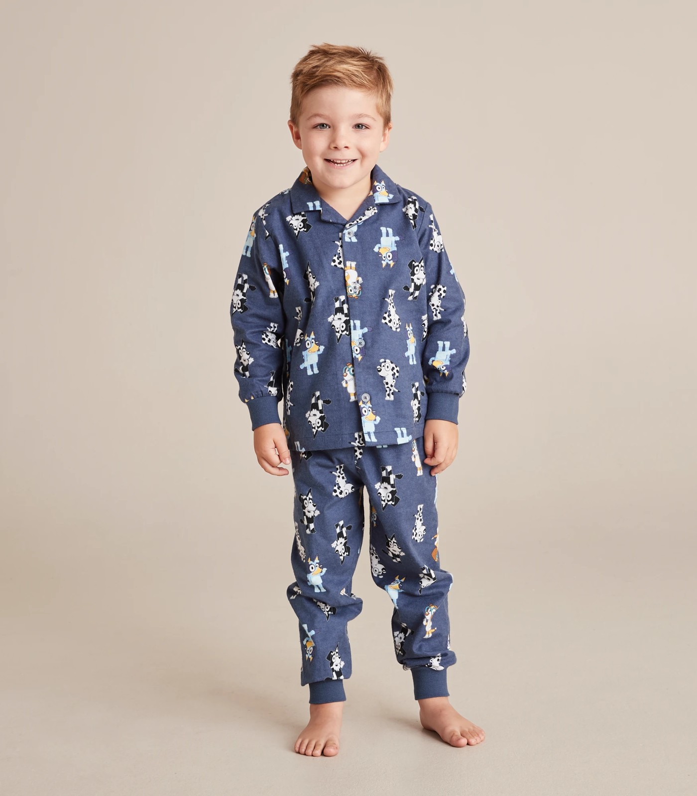Fans will sleep blissfully in the navy Bluey Cotton Flannelette Pyjama Set, featuring a collared button up top and matching pants, crafted from soft cotton for all night comfort.