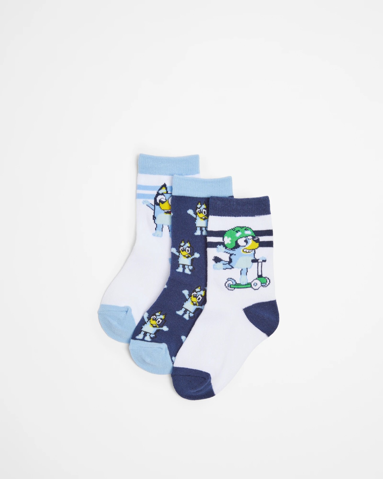 These 3 Pack Bluey Crew Socks are the perfect blend of comfort and style. Crafted with soft cotton poly blend material, these socks will keep feet comfortable all day long. A variety of Bluey print designs add a fun touch to these classic crew length socks, making them a great choice for boys. With three pairs of socks in each pack, there's plenty to choose from!