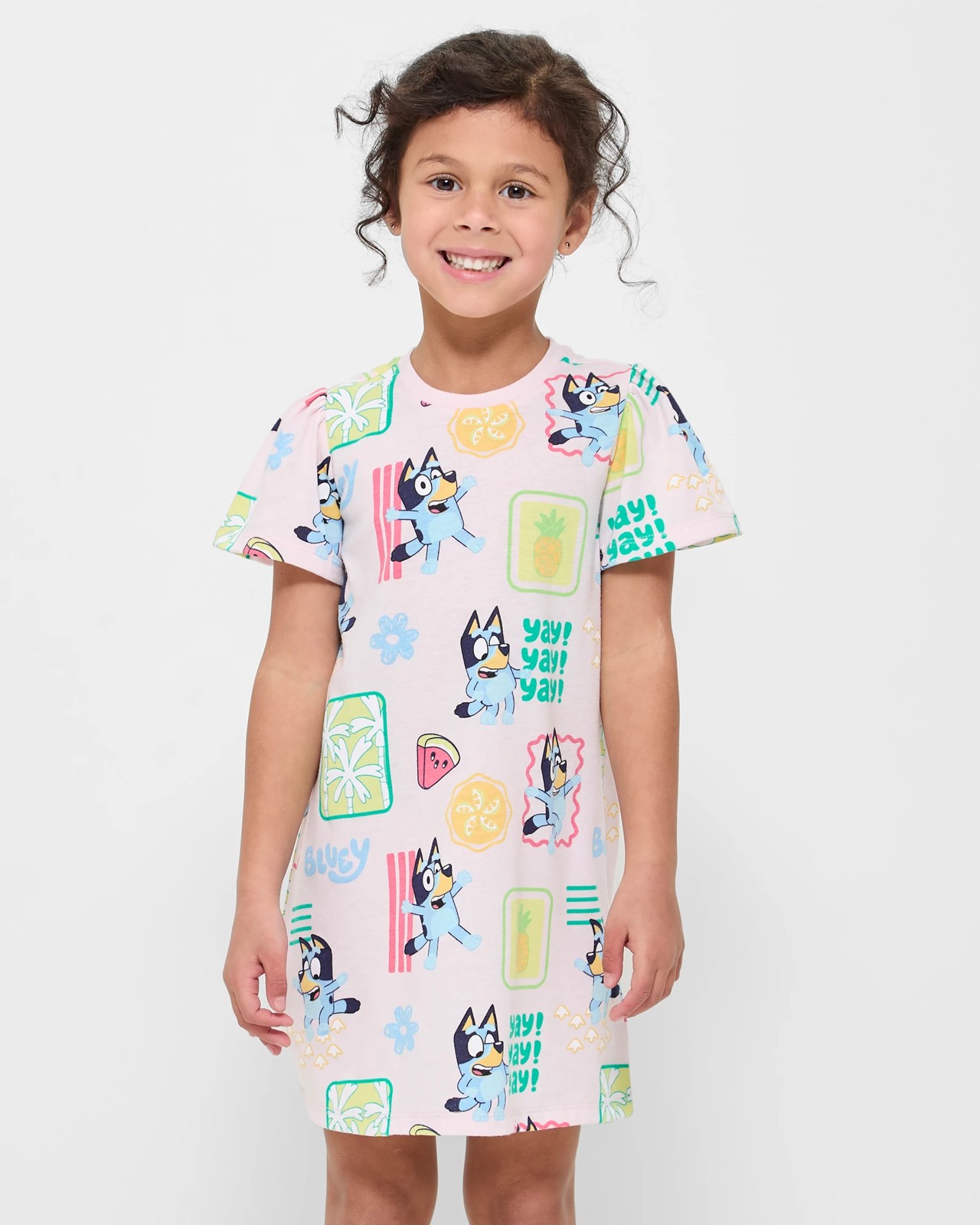 Step into the world of Bluey with this charming nightie that's perfect for bedtime adventures. Featuring an enchanting all-over tropical Bluey character print, this nightie is designed for both comfort and style. With a regular fit, round neck, and delightful frill sleeves, it's easy to see why this will become your little one's favourite nighttime outfit. Get ready for sweet dreams and happy mornings. Order yours today and make bedtime fun and fabulous!