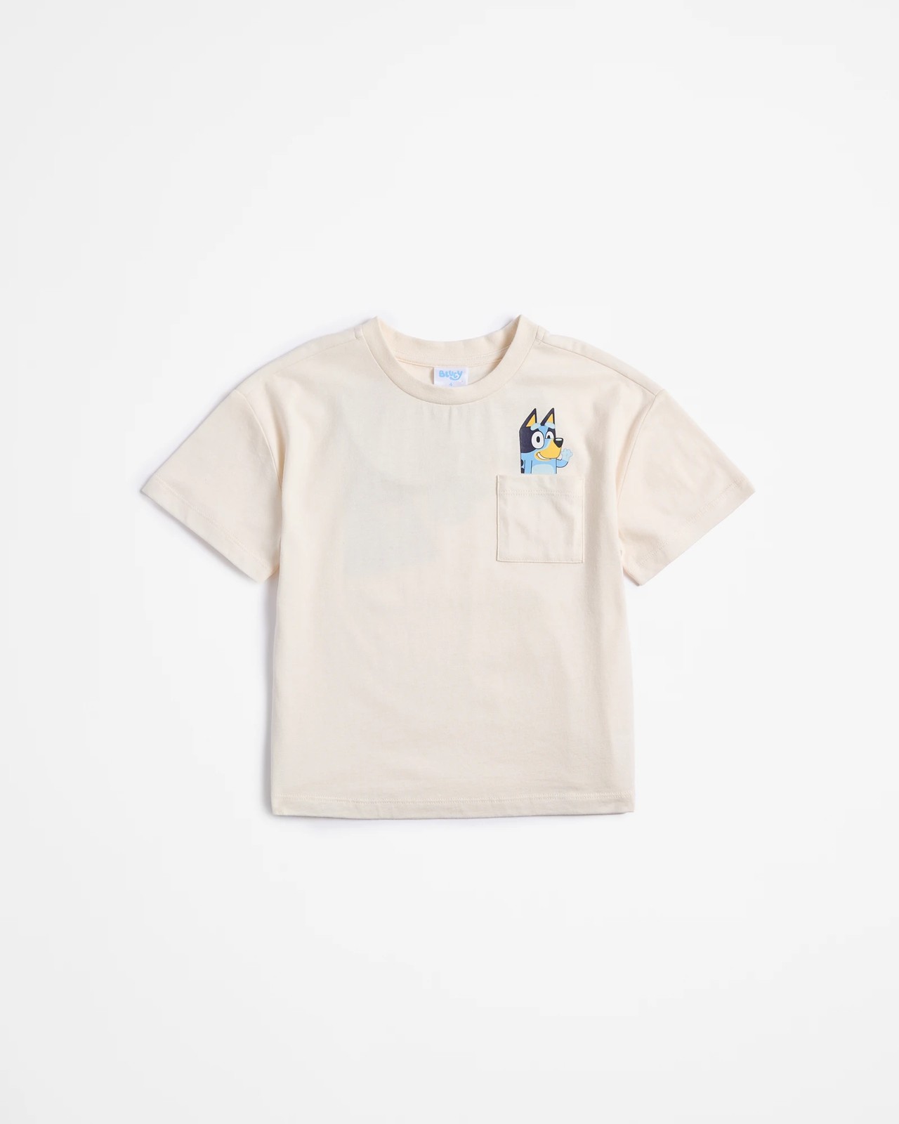 This Bluey Pocket T-shirt for boys combines comfort and creativity in one delightful package. Made from soft and breathable cotton, it boasts a regular fit and a classic crew neck design. The cream colour makes it easy to pair with any outfit, while the chest pocket features a playful Bluey print. On the back, a larger Bluey graphic adds extra fun, making this shirt a favourite for any young fan. Perfect for both adventurous days out and relaxing at home, it's a charming addition to any wardrobe. Get yours today for style and smiles all around.