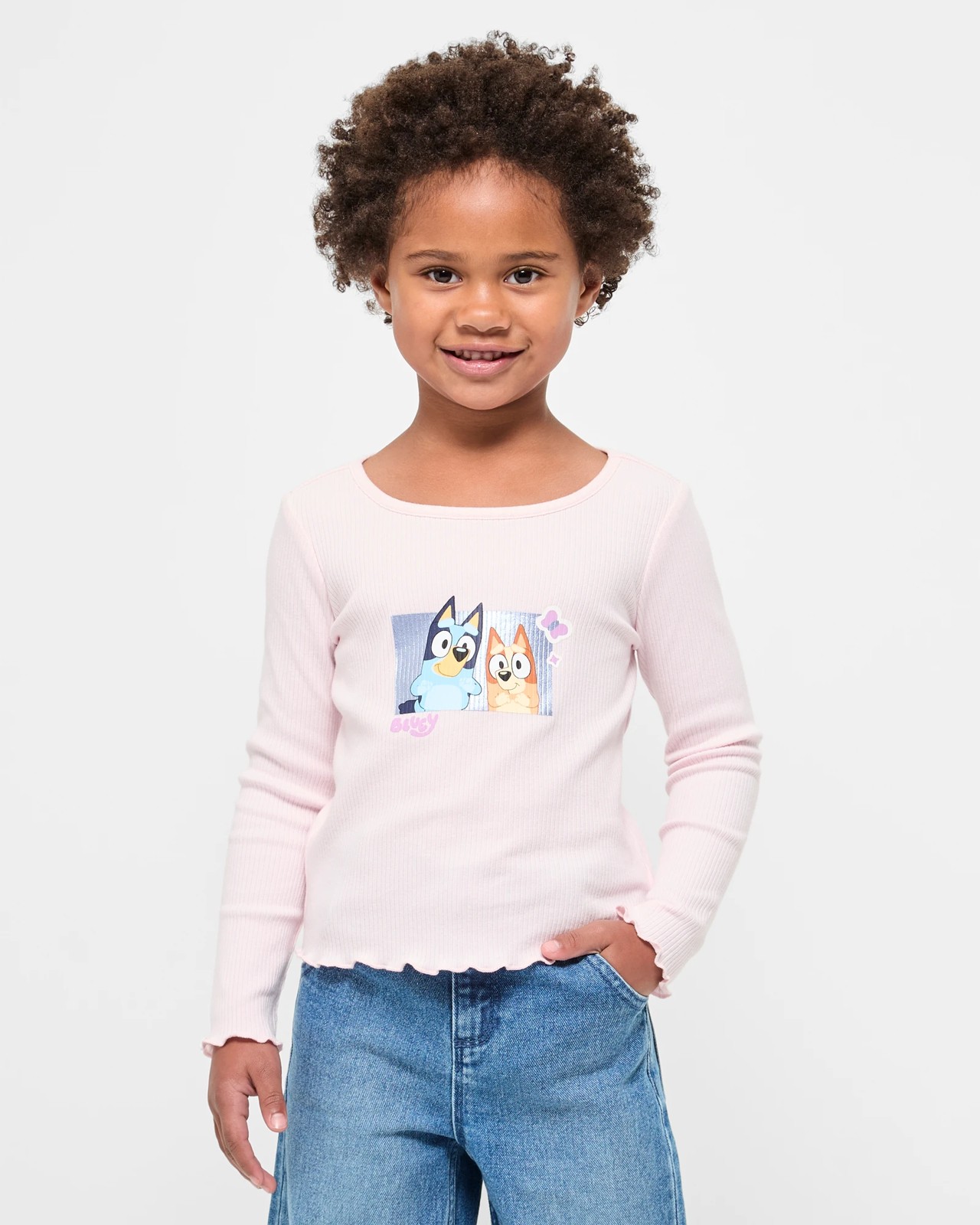 Discover the joyful Bluey Rib Long Sleeve Top, an essential piece for every young fan of the cheerful blue pup. Made from soft cotton rib with a hint of stretch, this top ensures your little one remains comfy all day. With an eye-catching foil print of Bluey on the front, it adds a touch of shimmer to any outfit. The pleasant pink colour, along with endearing lettuce hem and cuffs, makes it a versatile addition that pairs wonderfully with jeans or skirts. Offering a regular fit and classic crew neck, your child will enjoy style as well as ease of movement. Don't miss out on this charming top – it's ideal for daily wear or special adventures. Get yours today and brighten up your child's wardrobe!