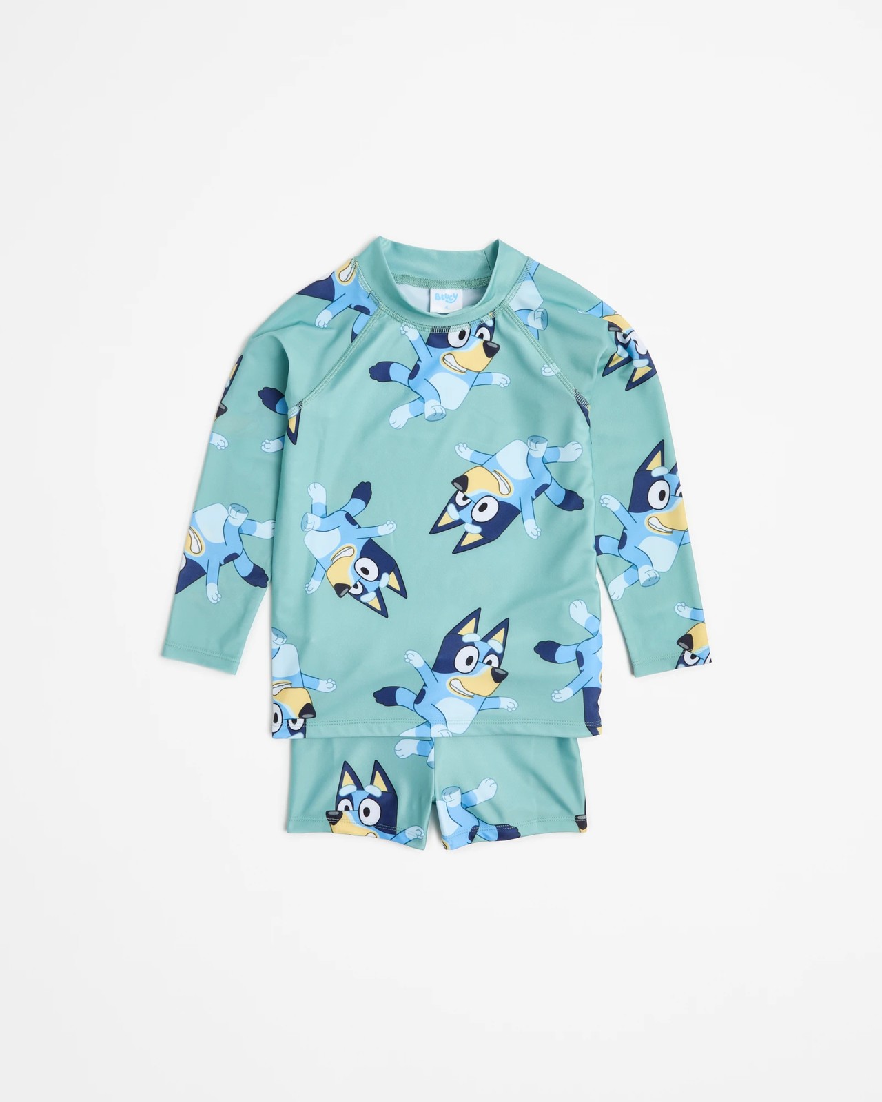 Dive into summer fun with the Bluey Swim 2 Piece Set. Perfect for little adventurers, this adorable swimwear offers excellent UPF 50+ sun protection, ensuring your little one stays secure while they splash around. The set includes a top with a stand collar and long raglan sleeves, allowing for full movement in the water, and matching shorties with an elastic waistband for comfort. The vibrant green, all-over Bluey print brings their favourite character to life. Make a splash this season – get your Bluey Swim 2 Piece Set today!