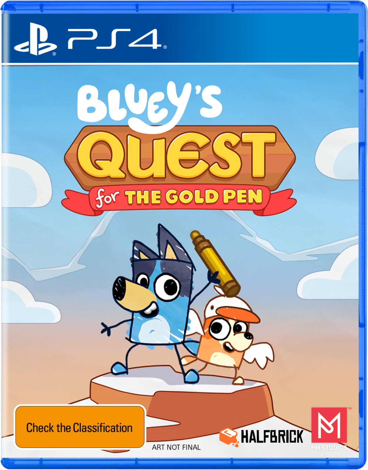 EMBARK ON A HEART-WARMING ADVENTURE: Bluey is drawing her imaginary world when Dad suddenly yoinks the Gold Pen she needs! Transported into Bluey's hand-drawn imagination, Mum designs the imaginary lands, Dad rocks up on his cool bike as self-declared King Goldie Horns, and Bingo transforms into her honk-happy alter ego — Bingoose! Away they go on an exciting quest to retrieve the Gold Pen - and have heaps of fun along the way.