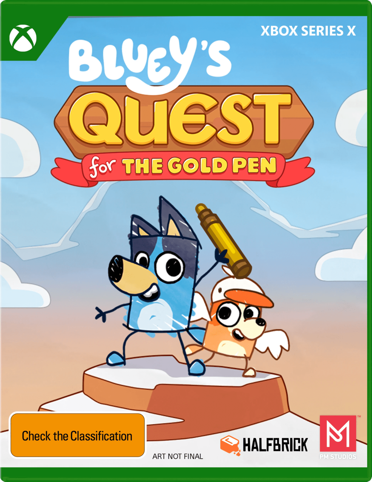 EMBARK ON A HEART-WARMING ADVENTURE: Bluey is drawing her imaginary world when Dad suddenly yoinks the Gold Pen she needs! Transported into Bluey's hand-drawn imagination, Mum designs the imaginary lands, Dad rocks up on his cool bike as self-declared King Goldie Horns, and Bingo transforms into her honk-happy alter ego — Bingoose! Away they go on an exciting quest to retrieve the Gold Pen - and have heaps of fun along the way.