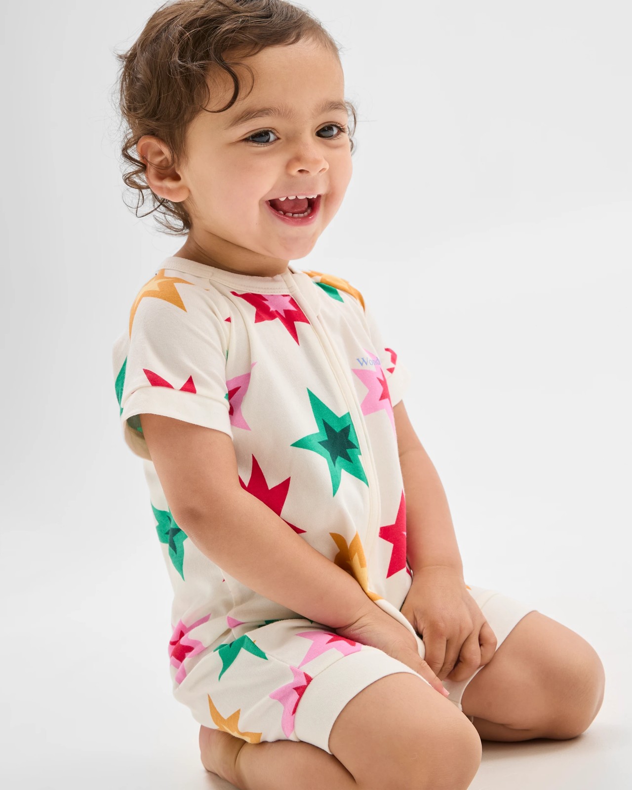 Introducing the Bonds Baby Zippy Romper, the perfect blend of comfort and style for your little one. This wondersuit romper showcases an eye-catching all-over print and a ribbed round neck with delicate Bonds tape on the inside. The zip front, complete with a protector, ensures quick and easy changes while safeguarding your baby's sensitive skin. Designed with short raglan sleeves and ribbed cuffs for added snugness, this romper also features a roomier drop crotch and short leg shape, making it ideal for warmer days. Available in a variety of vibrant colours and prints, the Bonds Baby Zippy Romper is a must-have addition to your baby's wardrobe. Make changing time a breeze and let your baby explore in comfort and style!