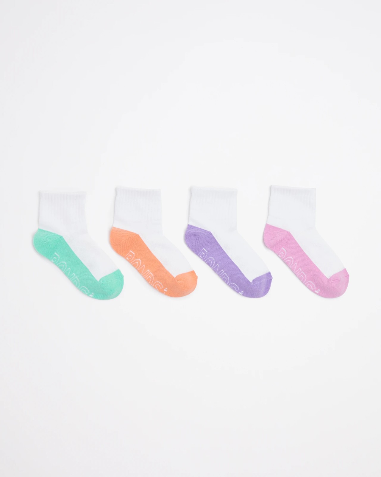 The Bonds Girls 1/4 Crew Socks - 4 Pack will keep her feet feeling cool and comfortable all day long! Crafted with a blend of cotton and nylon, these regular fit socks provide lightweight coverage and breathability. The 1/4 crew length comes in white with a variety of coloured soles for added style. Mesh cooling zones are also included to help keep her feet dry and comfortable. Perfect for everyday wear, the Bonds Girls 1/4 Crew Socks - 4 Pack is an essential item for any wardrobe!