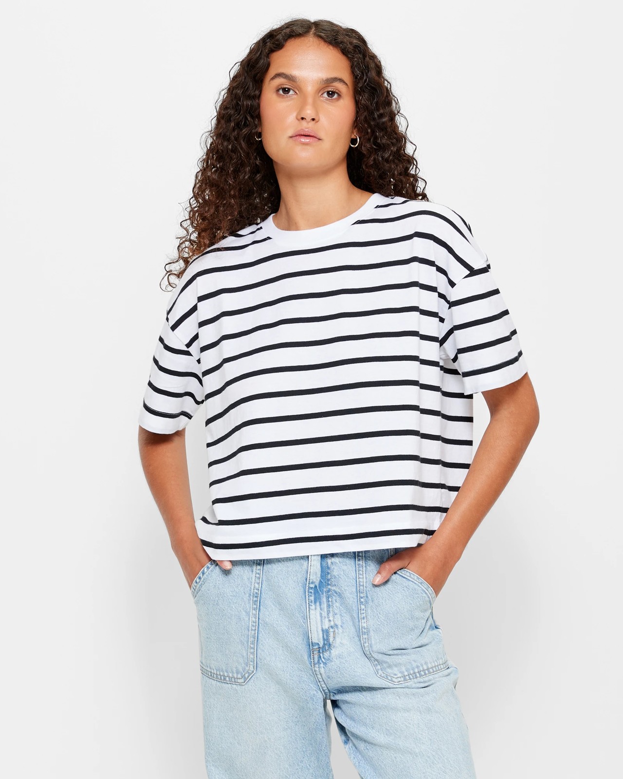 This Boxy Crop T-Shirt is the perfect addition to your off-duty style. Crafted from breathable cotton, this relaxed fit t-shirt features a boxy design and ribbed crew neckline. It also offers short sleeves and a straight hemline that falls to a cropped length. Wear it with jeans or shorts for a timeless weekend look.