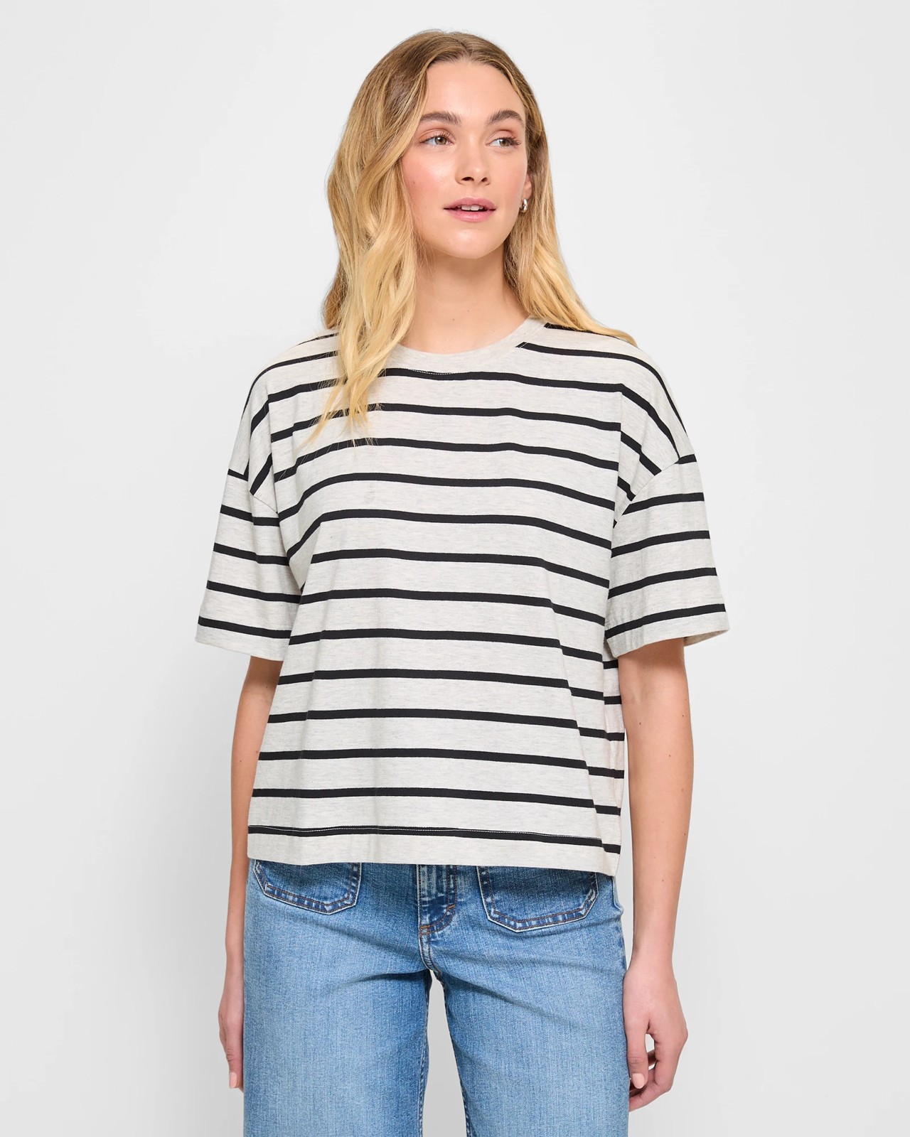 Step up your wardrobe with our Boxy Crop T-Shirt that boasts a relaxed fit and stylish design. The top features a trendy striped design, ribbed crew neckline and short sleeves for a chic look. The Boxy Crop T-Shirt is perfect for casual outings or lounging at home, offering both comfort and style in one versatile piece. Elevate your everyday style effortlessly by adding our Boxy Crop T-Shirt to your collection. Treat yourself to a fashion upgrade and stay trendy with our must-have Boxy Crop T-Shirt!