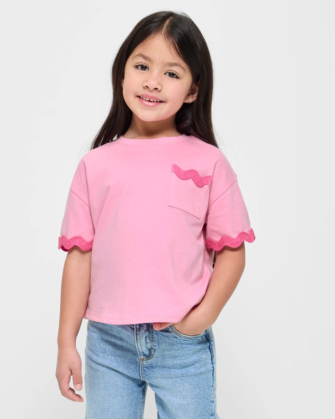 Discover the charm with the Boxy Ric Rac T-shirt - a timeless piece for your little one's wardrobe. Featuring adorable wavy cuffs, this t-shirt adds a delightful touch to any outfit. The chest pocket with its cute trim offers both style and a bit more functionality. With its regular fit and crew neck, your child will enjoy comfort while looking ever so stylish. Its straightforward yet playful design makes this t-shirt a wardrobe essential.