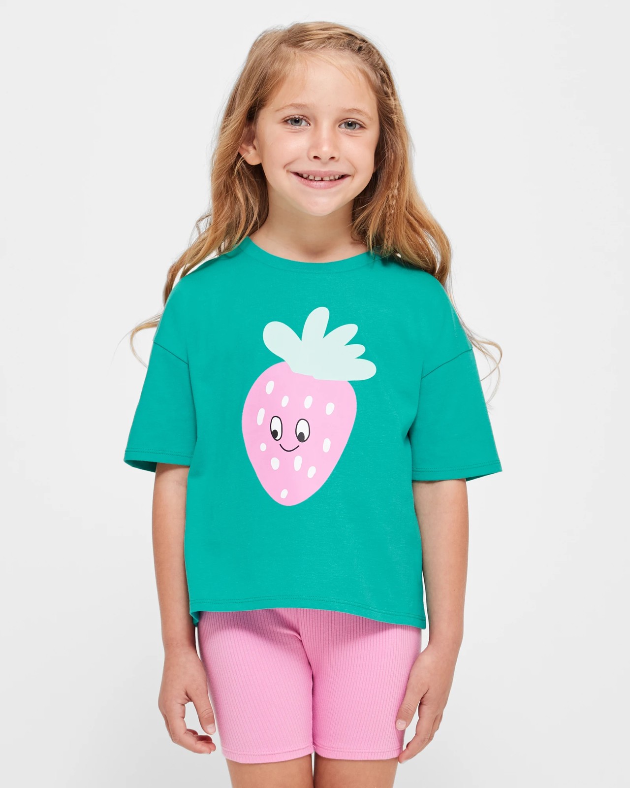 Get ready for summer with this adorable Boxy T-shirt and Bike Shorts 2 Piece Set. Made from a soft cotton material, this set is designed for ultimate comfort and durability. The green t-shirt features a ribbed crew neck and short sleeves, with a large strawberry print on the front adding a fun and playful touch. The straight hem provides a neat and polished look. The pink ribbed bike shorts have an elastic waistband for a snug fit, and the short length allows for easy movement. Perfect for playdates or outdoor adventures, this set is a must-have addition to any little girl's wardrobe. Update her summer style with this trendy set today!