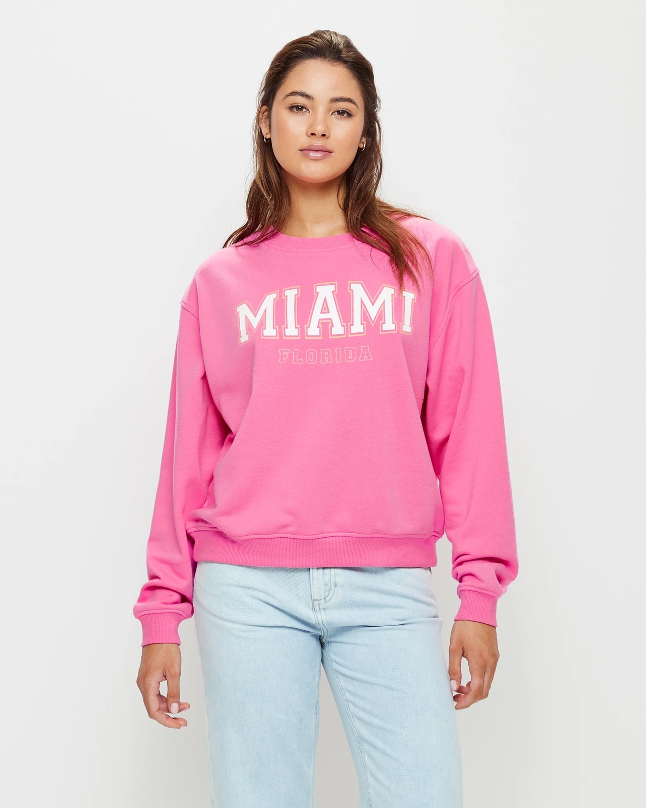 Our stylish and comfortable Lily Loves Boyfriend Sweater is perfect for all your wardrobe needs. Crafted from a cotton/polyester blended fabrication, it features an oversized fit with a ribbed crew neckline and long ribbed cuff sleeves. The bold chest print with wording “MIAMI FLORIDA” adds an extra touch of style to the look, while the straight ribbed hemline ensures the perfect fit. With its bright pink hue, this sweater is sure to become your new favorite!