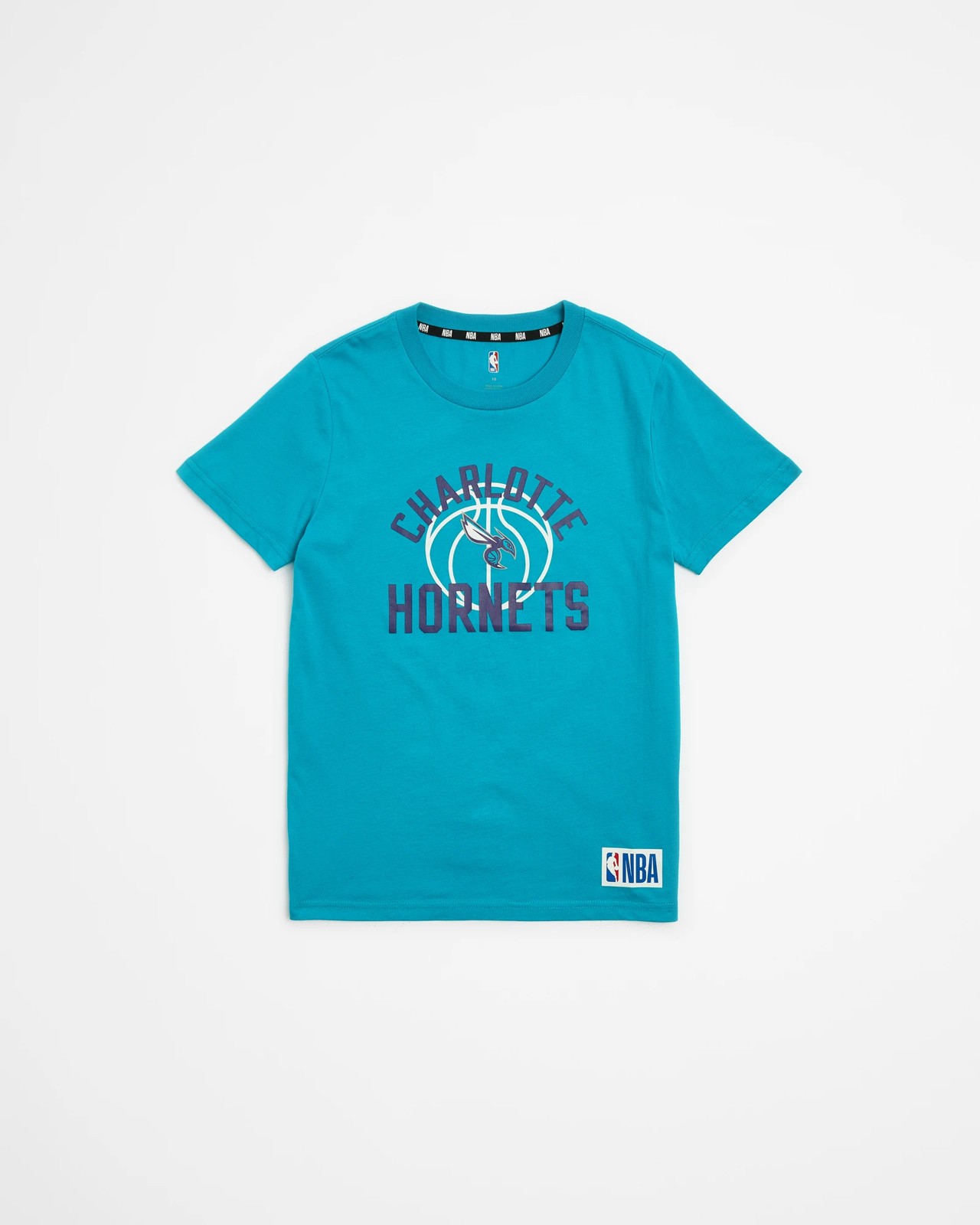 Boys Charlotte Hornets T-shirt – NBA. Get your young fan ready to support their favourite team with our Boys Charlotte Hornets T-shirt. Made from cotton and designed for comfort, this regular-fit tee in vibrant teal features a ribbed crew neck and short sleeves. The bold Charlotte Hornets print on the front is perfect for showing off their team pride. Perfect for game days or casual wear, this T-shirt is a must-have addition to any young basketball enthusiast's wardrobe. Let them cheer in style and comfort. Order today!