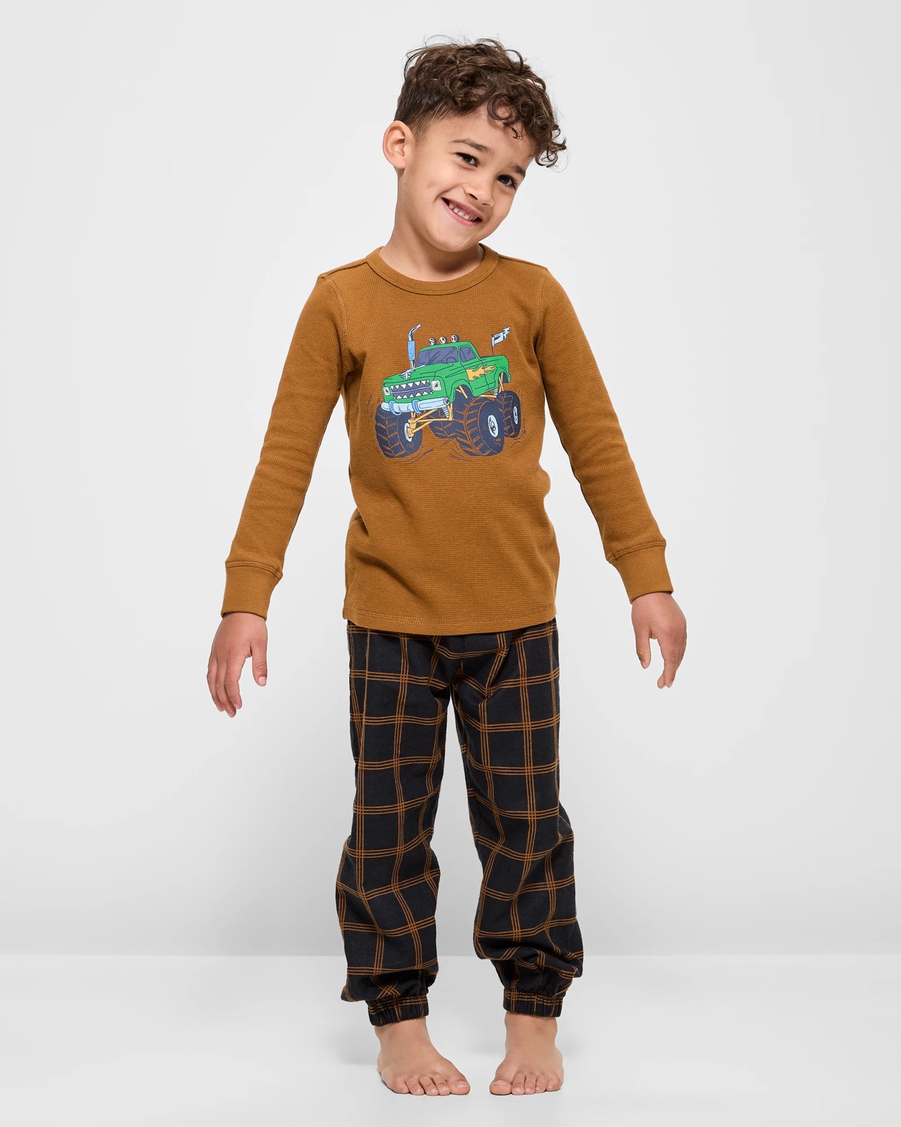 Boys Cotton Long Sleeve Waffle Flannelette Pyjama Set - Monster Truck 1 of 6