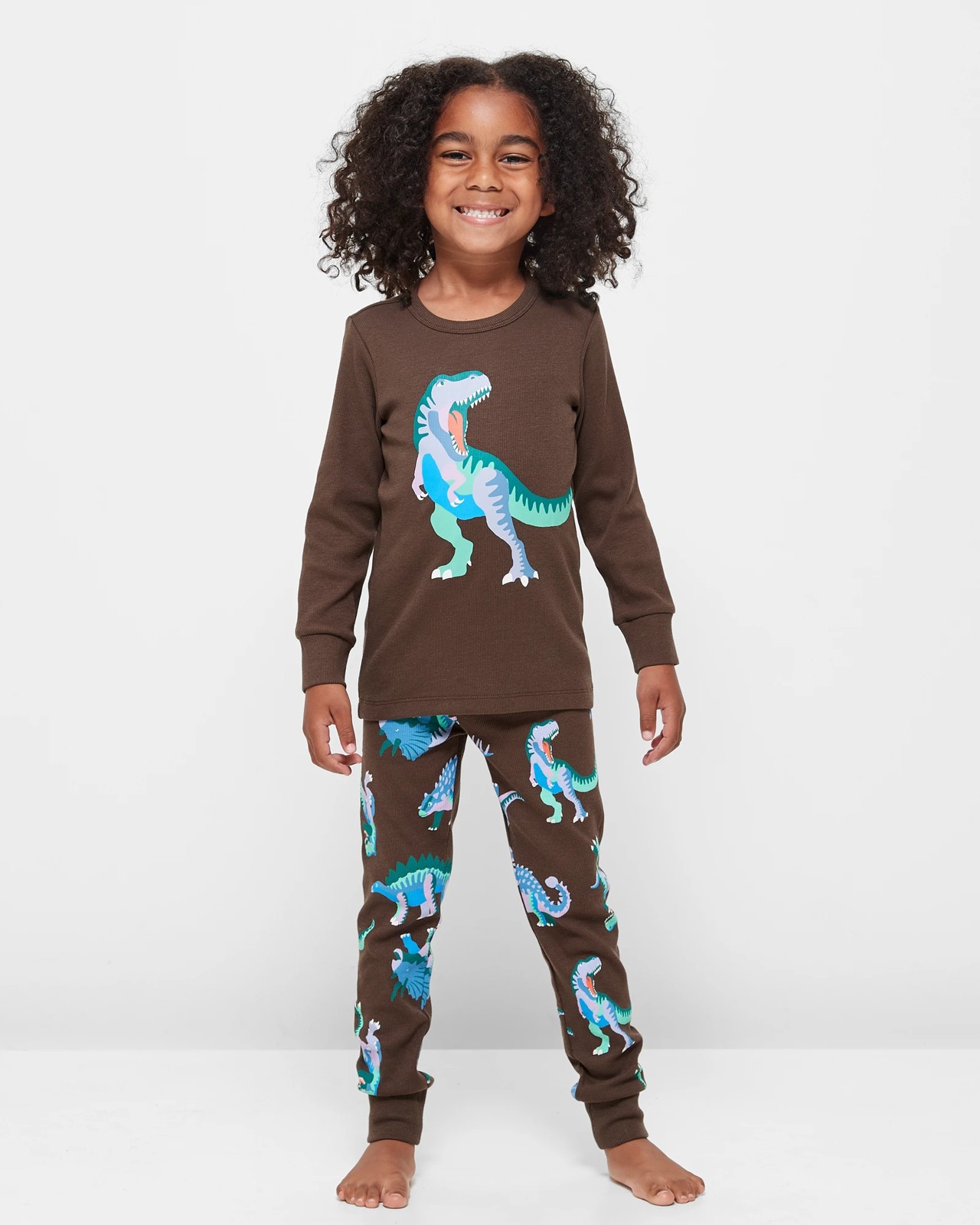 This Boys Dinosaur Rib Cotton Pyjama Set is perfect for bedtime adventures. Featuring a fun and engaging large dinosaur print, this two-piece pyjama set is made from a comfortable cotton rib material with a hint of stretch to ensure a cosy fit. The long sleeves and ribbed cuffs keep warmth in while the elastic waistband pants make for easy wearing. Ideal for young dinosaur enthusiasts, this pyjama set ensures both comfort and excitement. Treat your little one to a fantastical bedtime journey today!