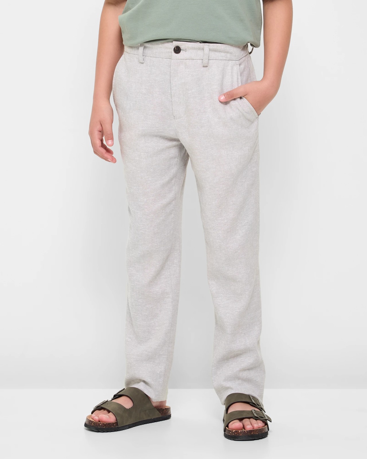 Perfect for any smart occasion, these Boys' Linen Blend Suiting Pants are designed with both style and comfort in mind. Made from a soft linen blend, they offer a regular fit that ensures ease of movement. The adjustable waistband and button and zip fly front make for a secure and comfy fit. Featuring side pockets and a single back pocket with a button, they combine practicality with sophistication. Pair these trousers with the matching suit blazer, sold separately, to complete the sharp look. Upgrade your young gentleman's wardrobe today!
